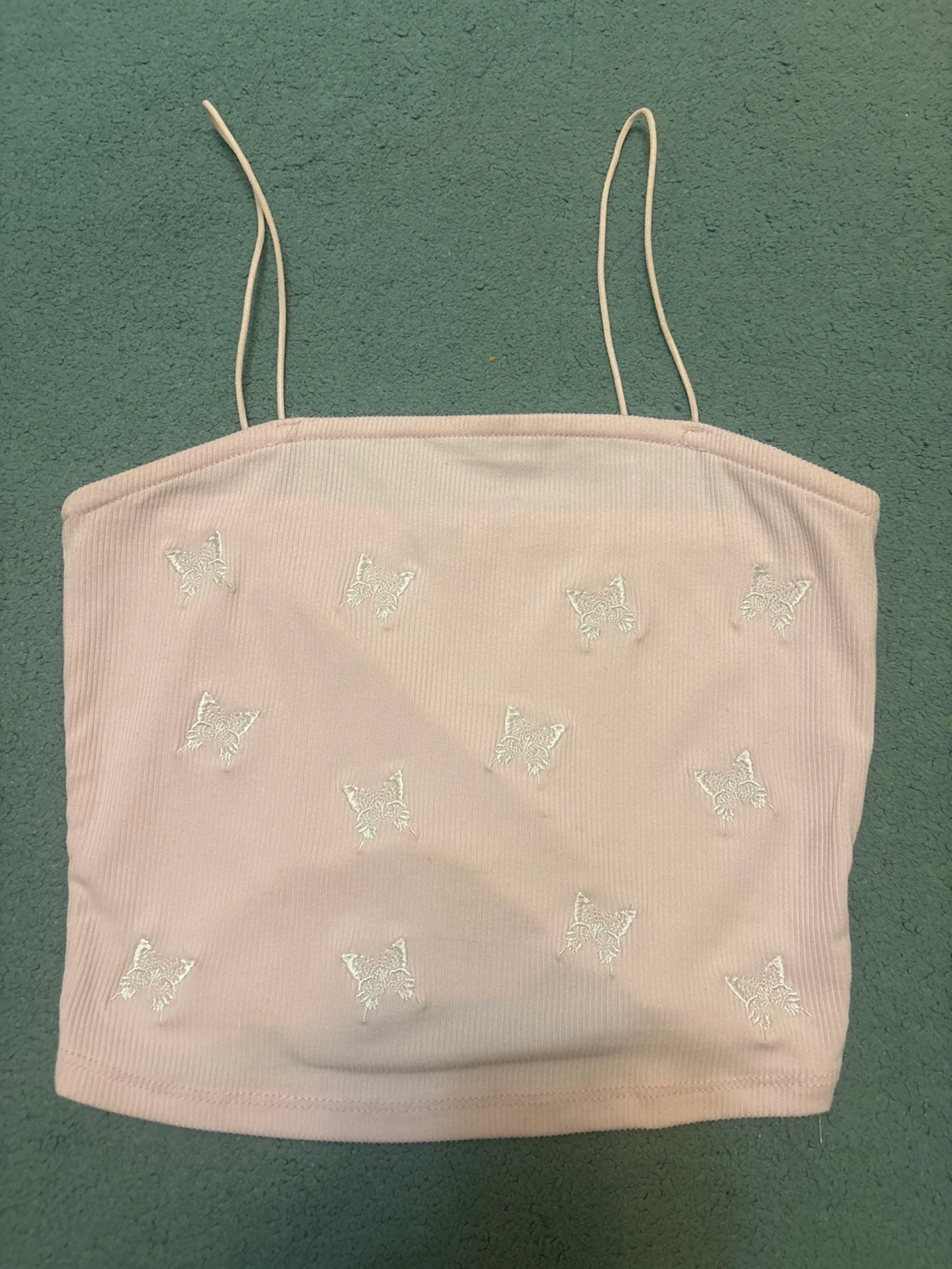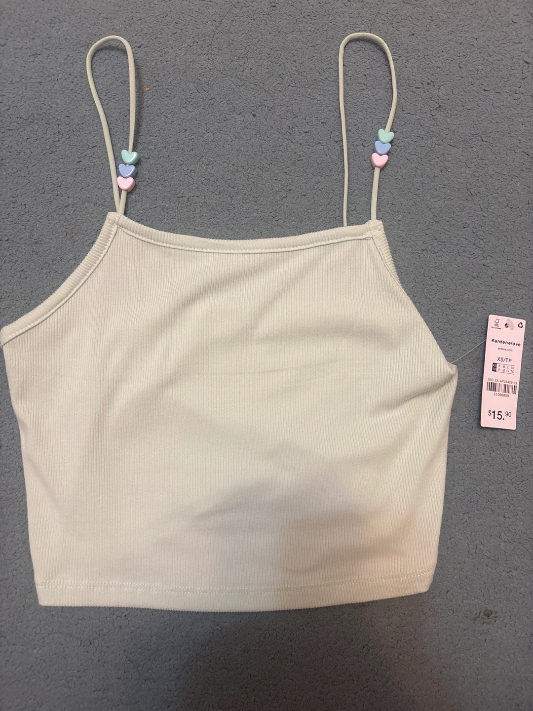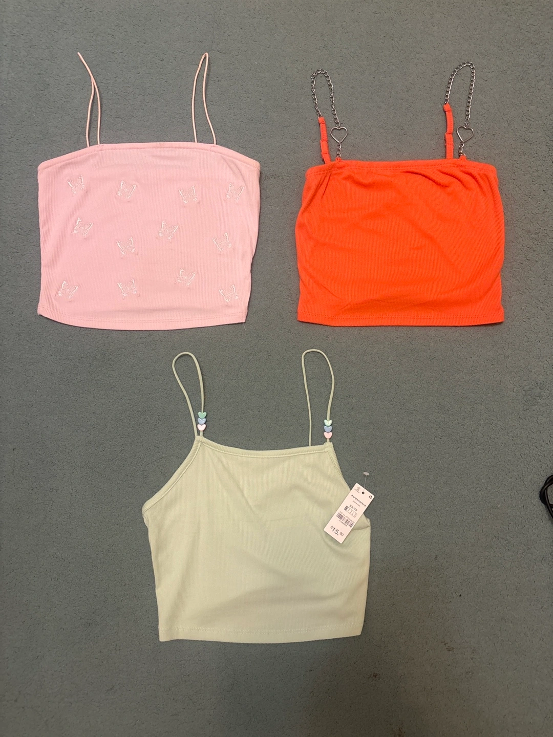 192I have three cute cami crop tops for sale! - One is a vibrant orange with chain straps and heart details, size XS/TP. - Another is a soft pink with butterfly designs, also size XS/TP. - The last one is a light green colour with heart beads on the straps. All are brand new and originally priced at $15 each.