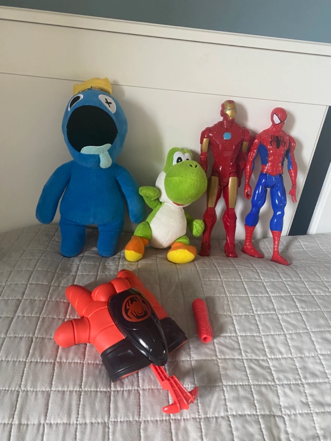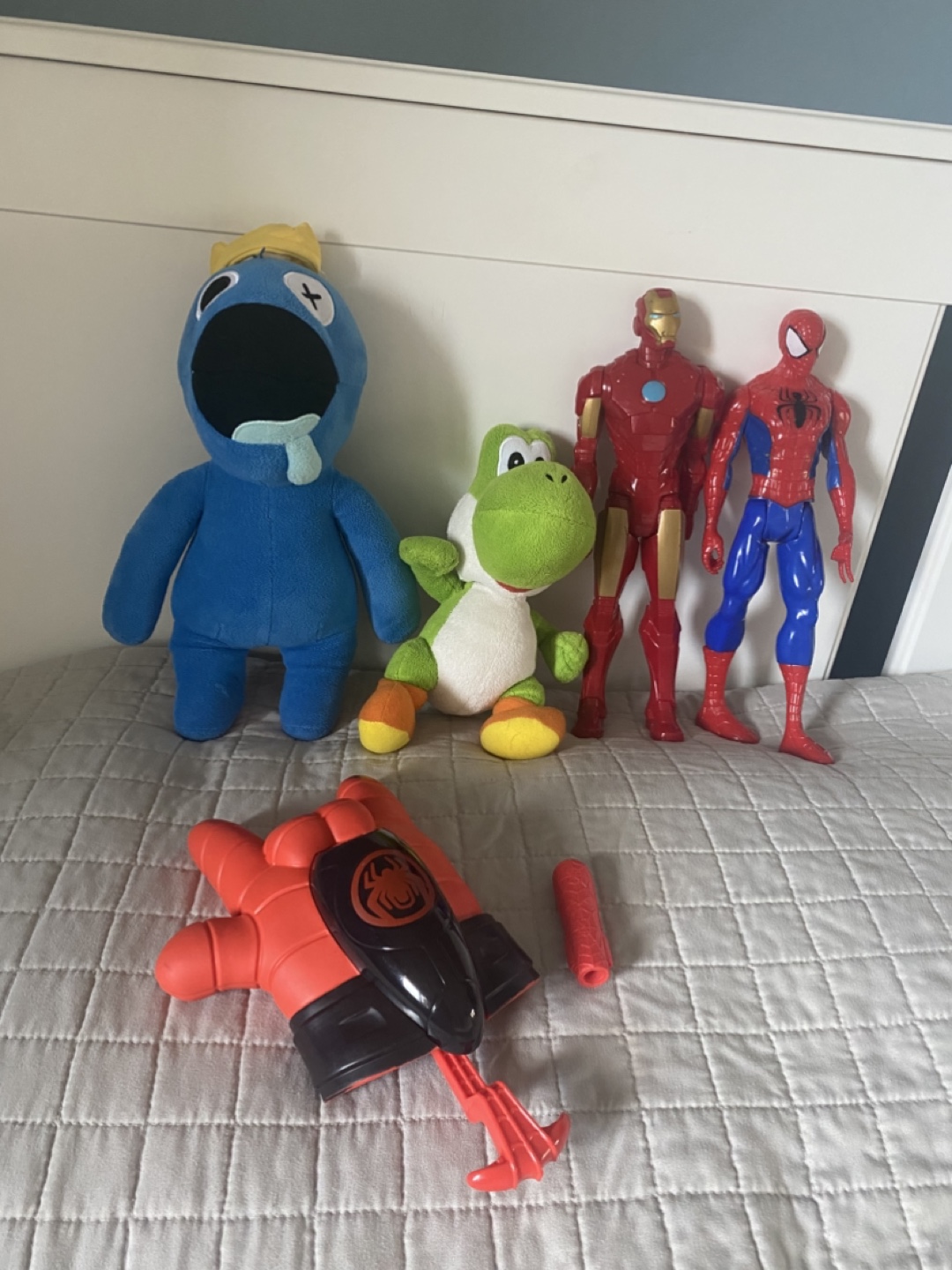 Selling a collection of toys. Included are a blue Rainbow Friends plush, a Yoshi plush, and Iron Man and Spiderman action figures. Plus, there's a red Spiderman glove!