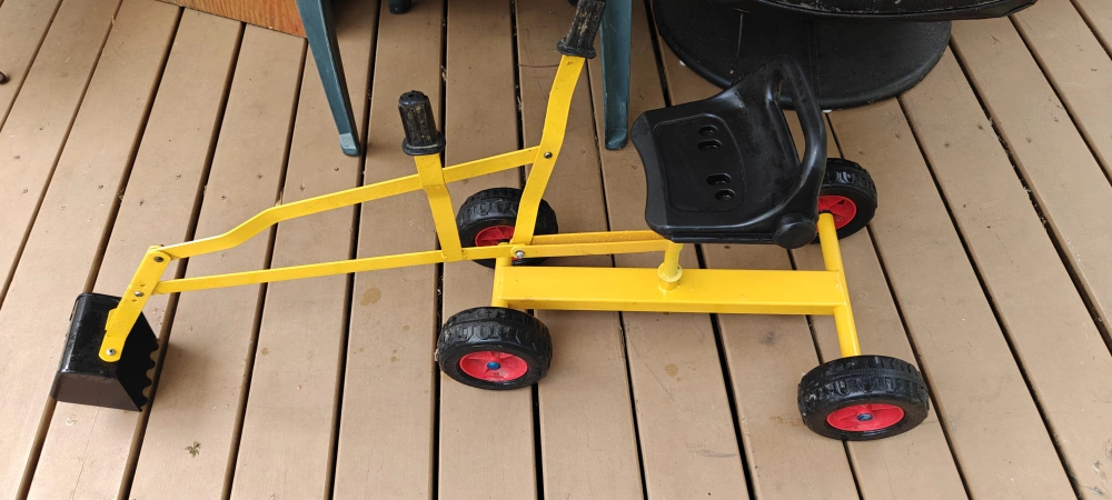 Selling a kids ride on excavator toy. It's yellow and black, with a seat and wheels. Perfect for outdoor fun!