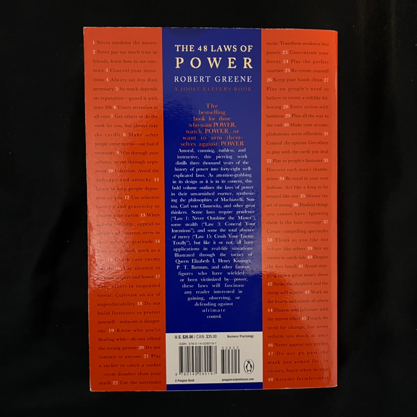 160Selling "The 48 Laws of Power" by Robert Greene. It's a fascinating book that delves into the dynamics of power throughout history. A must-read for anyone interested in understanding human behaviour and strategy. It's a Joost Elffers book. Also in new-like excellent condition. ONLY Cash will accepted.