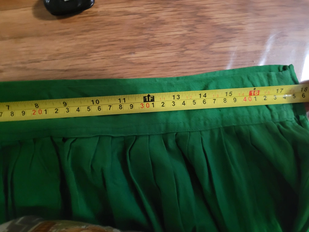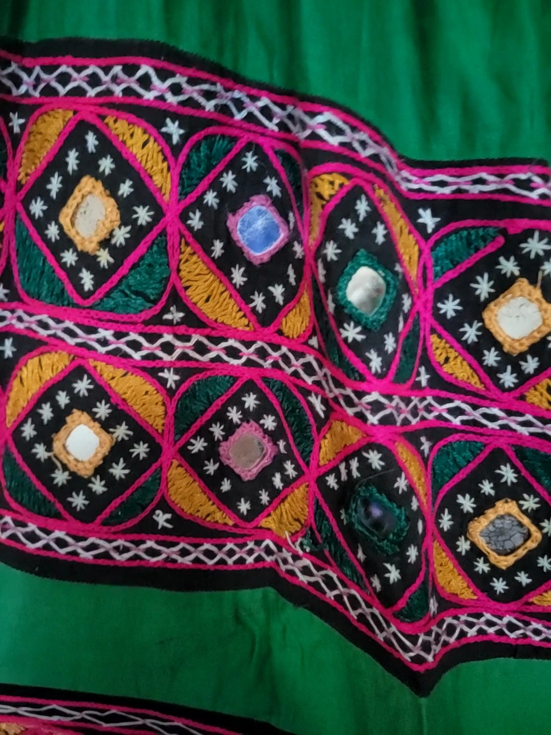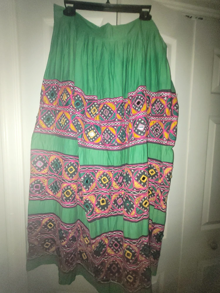 Selling a green floor length skirt with colourful embroidery! ponk, yellow, blavk with mirror work. 18 inches waist. i think its lkle medium or large. new.