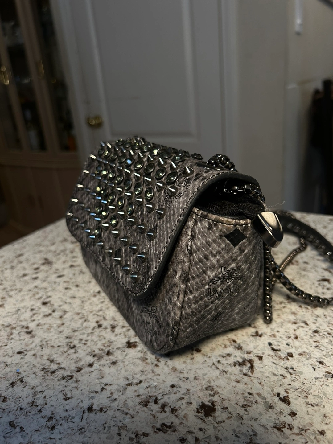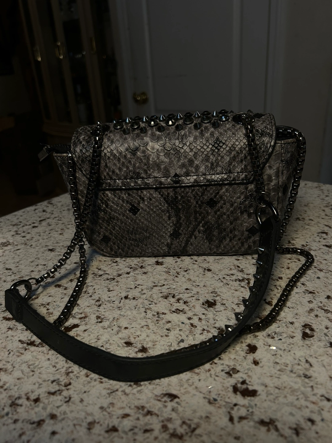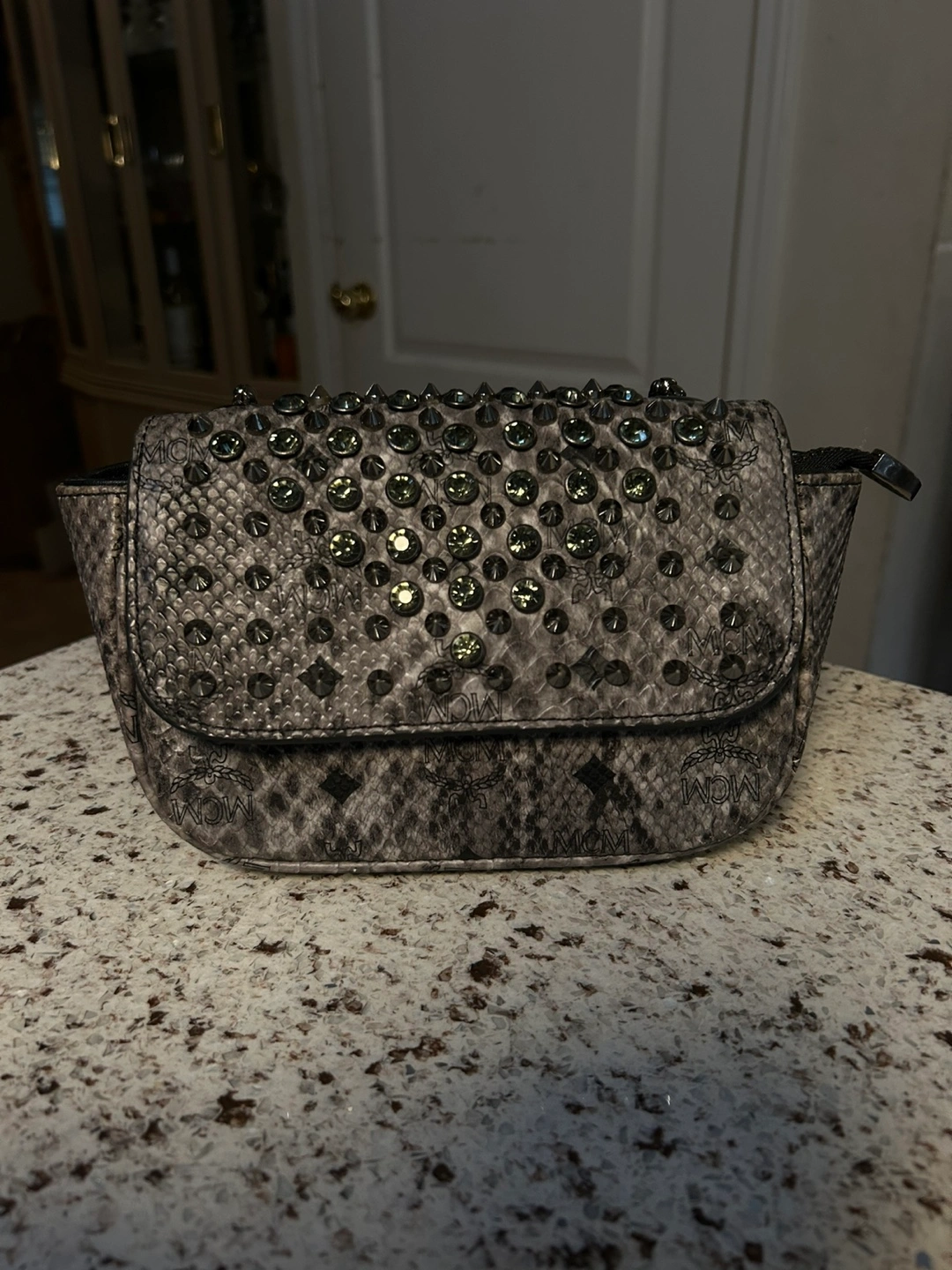 Snakeskin MCM belt bag with studded embellishments. This bag features a chain strap and the classic MCM logo pattern. It's in great condition and ready for a new home!