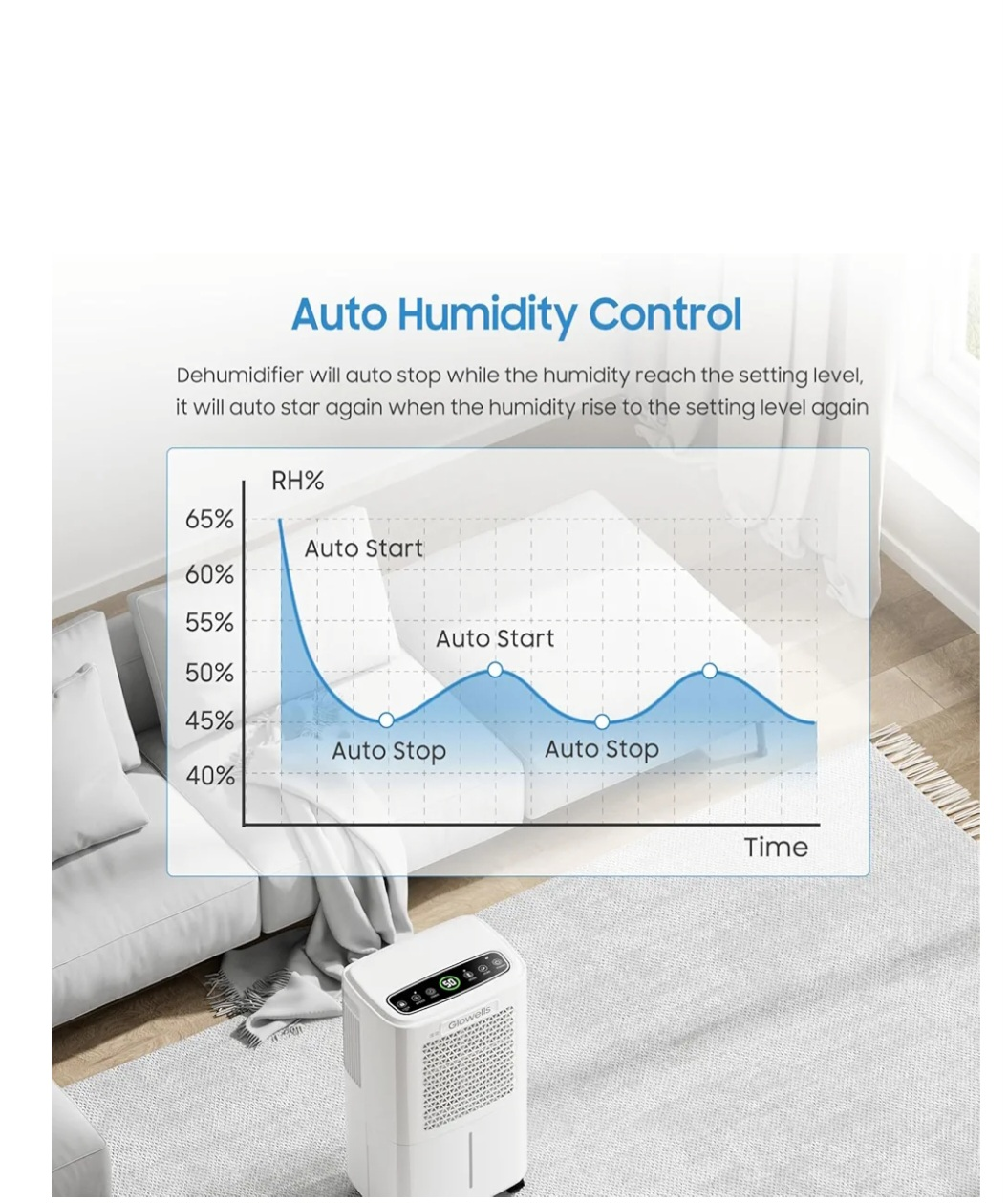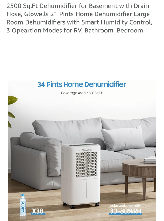 Keep your home comfortable with this Glowells 21 Pints Home Dehumidifier! It's designed for spaces up to 2,500 sq ft and features adjustable humidity control from 30-80% RH. Perfect for basements, bedrooms, or any room needing humidity management