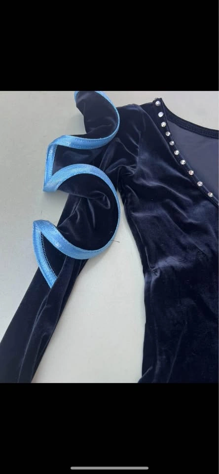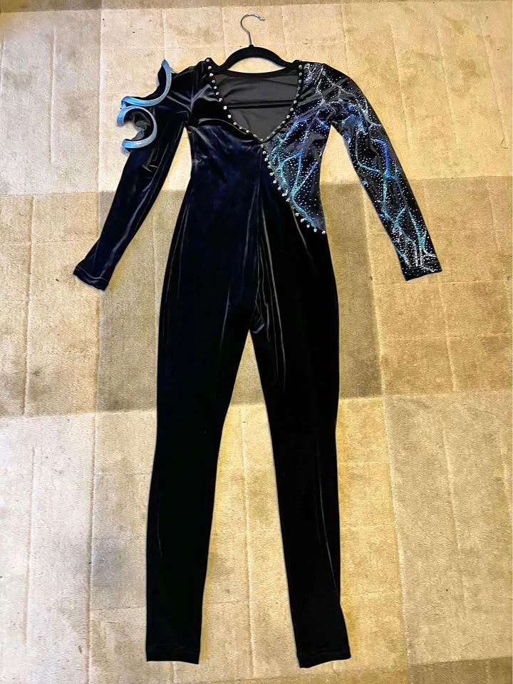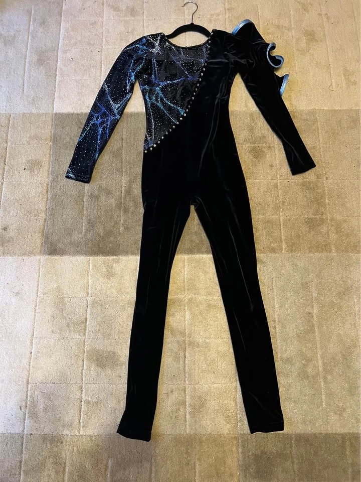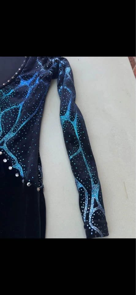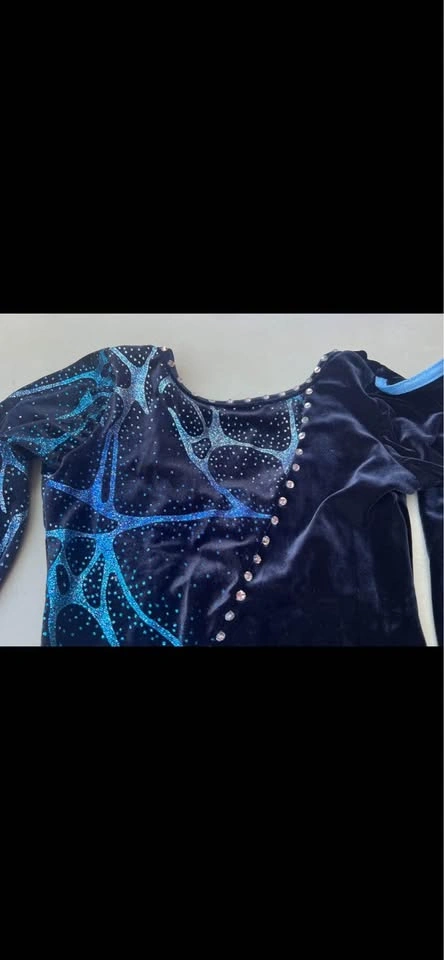 Beautiful velvet dance costume. One piece. Shoulder to crotch measures 23 inches. Hips measure 26 inches. The full length of the costume is 46 inches and NC measures 25 inches. Costume has beautiful hand painting, and Swarovski crystals on it. Item comes from a pet and smoke-free home. Costume is incredibly clean. Could suit any dancer from 9 to 12 years old. Fort Union/401/Pickering location