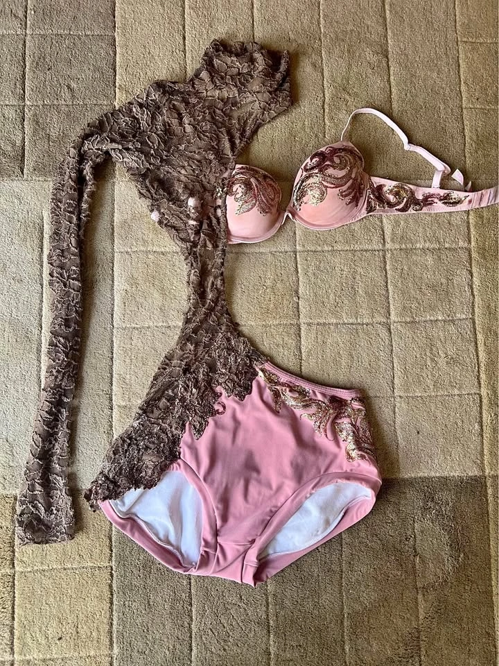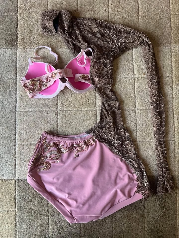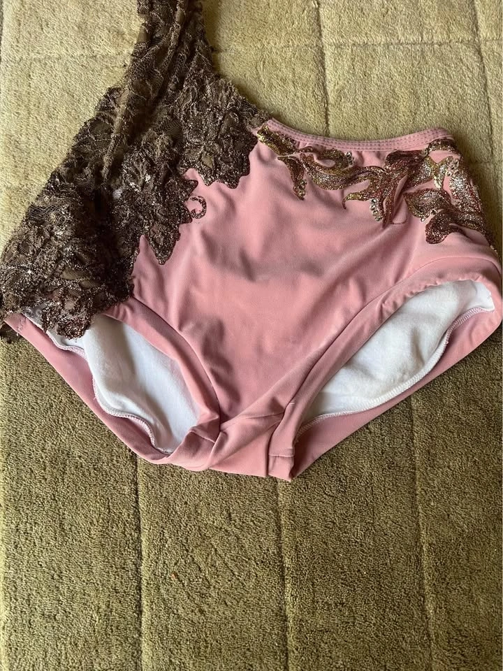 This light dusty rose/pink and brown costume is adult small. It was used for an acro routine. A size bra cup Created by Miss Effie’s team. Item comes from a pet and smoke-free home. Port union/401/Pickering for pick up.