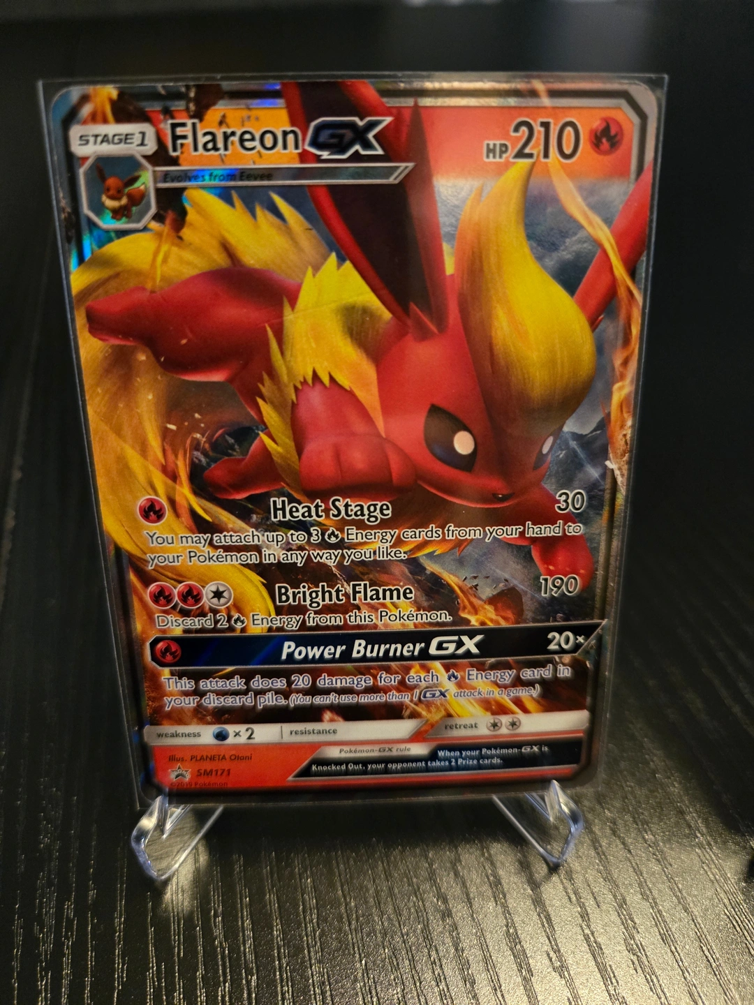 Flareon-GX promo (SM171) in Near-Mint—glossy holo, bright color, sleeved. Great companion to Jolteon/Vaporeon.