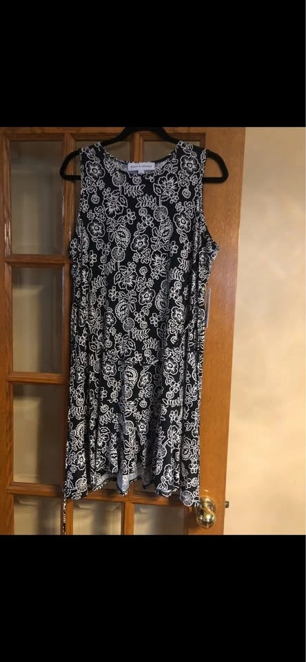 Very flattering and slimming. Black and white. Ready for spring. Wrinkle free. Polyester. Waist drawstring. Can be worn free-flowing. Size large. Item comes from a pet and smoke free home. Port union in 401 area or Pickering/Ajax for porch pick up
