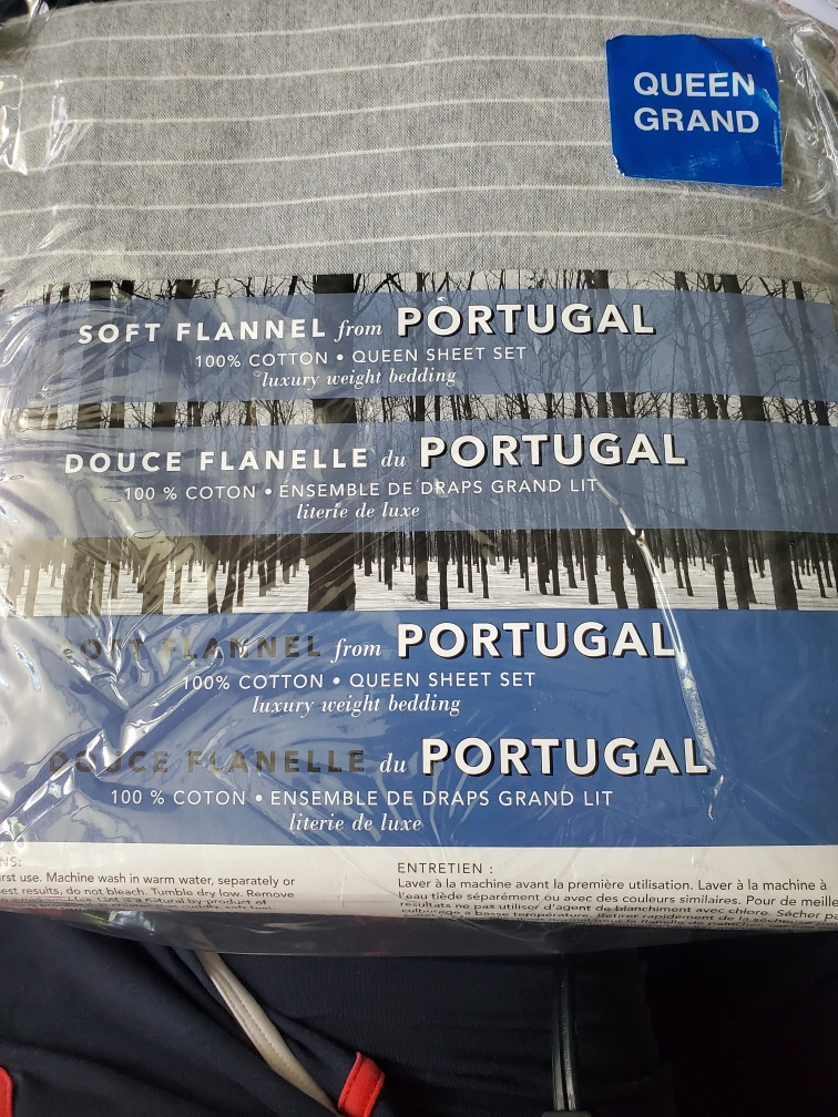 59Selling a brand new Queen Grand soft flannel sheet set, made from 100% cotton. It's a luxury weight bedding set, still in its original packaging. The flannel is from Portugal, ensuring a high-quality and cozy feel. Perfect for those chilly Canadian nights!