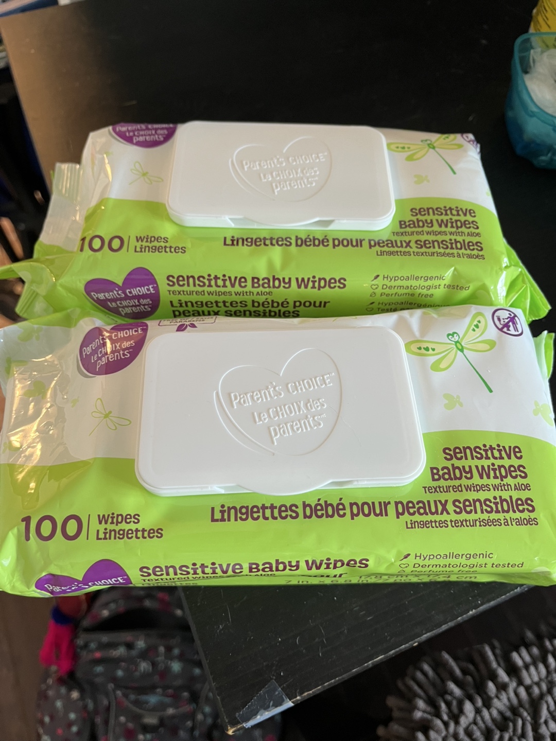 I have packs of Parent's Choice Sensitive Baby Wipes available! Each pack contains 100 wipes. These wipes are textured with aloe and are hypoallergenic, dermatologist-tested, and perfume-free. Perfect for your little one!