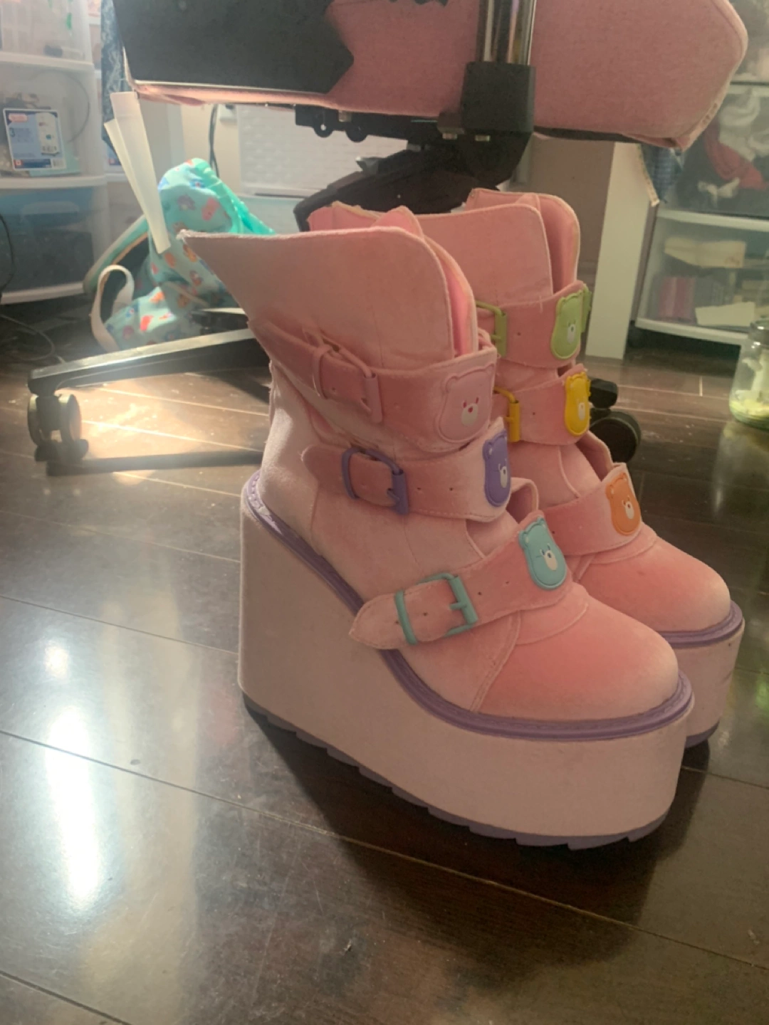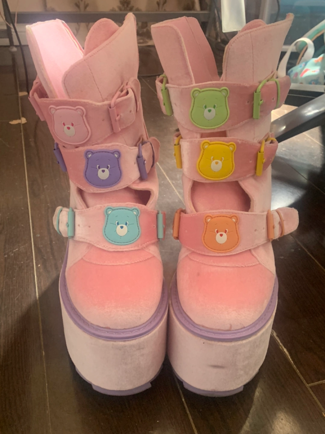 Pink velvet YRU SHOES care bears platform shoes! Each shoe has 3 straps each to tighten to your liking, so it could fit a size 9 or 11 too.
