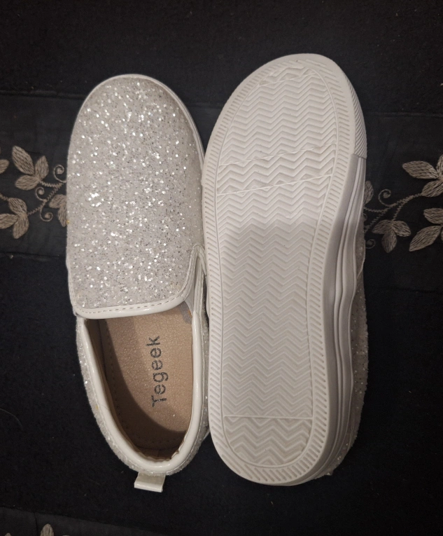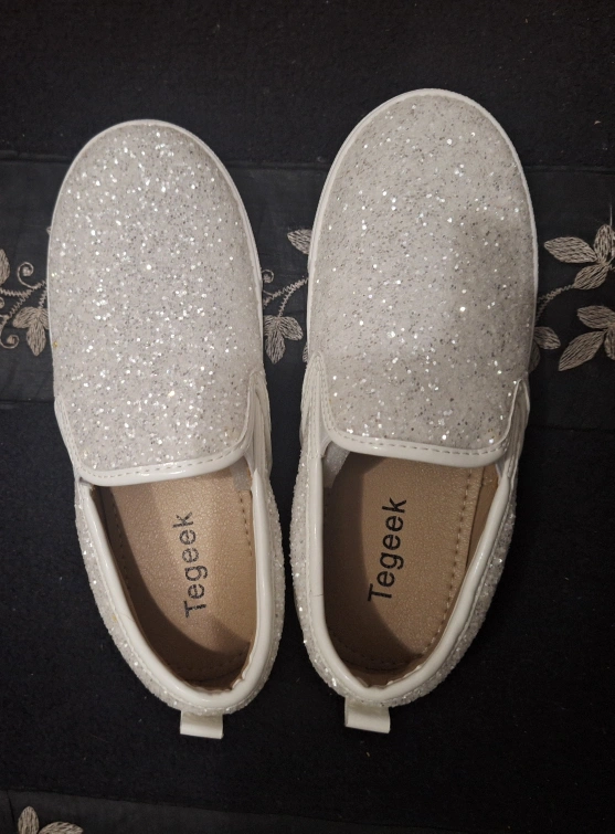 These Tegeek slip-on shoes are perfect for your little one! They're white with a glittery finish, adding a touch of sparkle to any outfit. The size is 13 (US/Canada). They are brand new and ready for a new home!