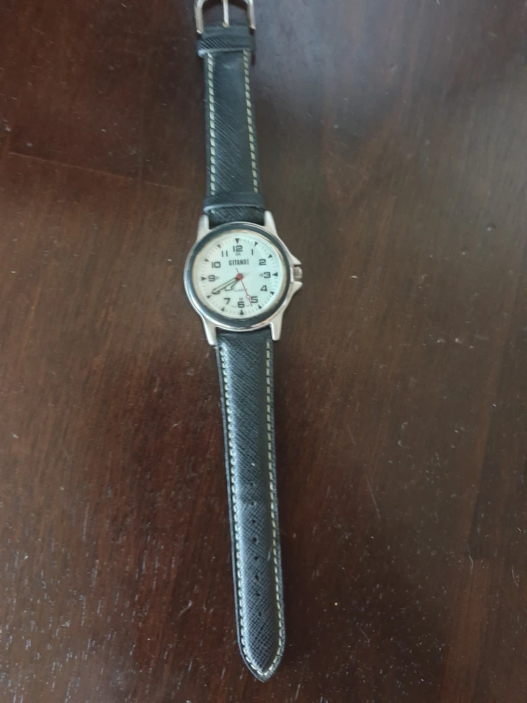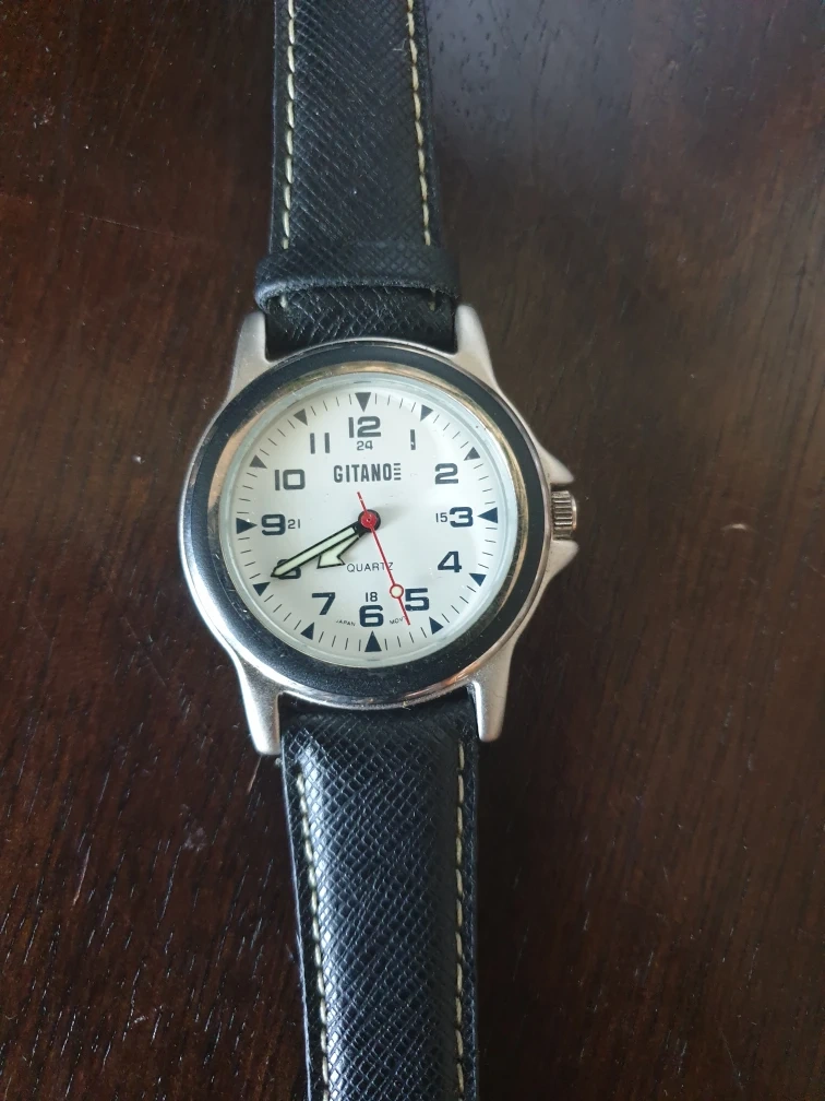 Here's a Gitano Quartz watch. It has a white face with black numbers and a black strap. It's a great everyday watch!