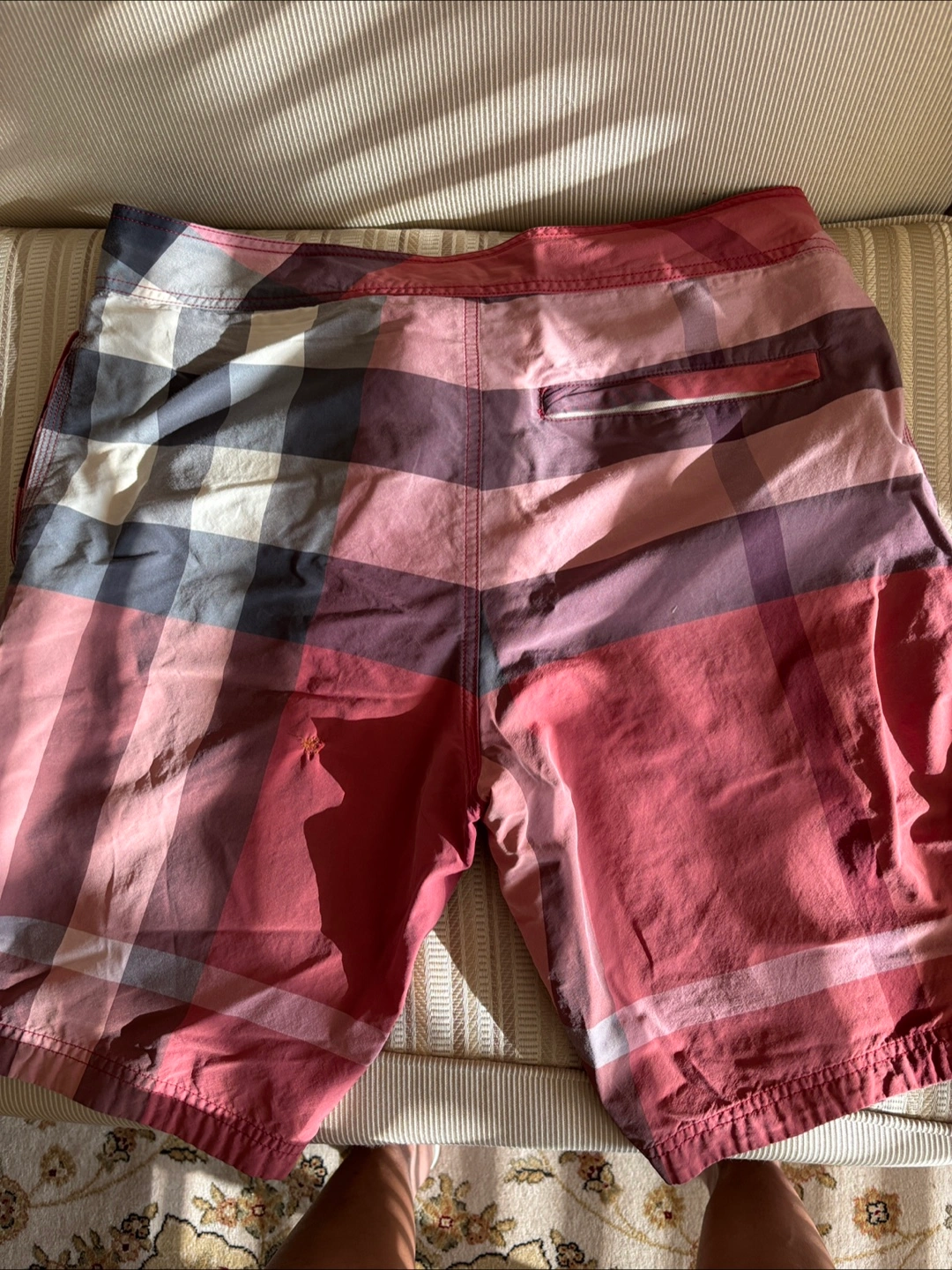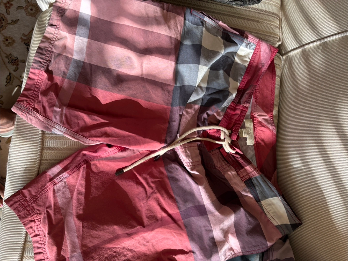 Selling a pair of Burberry swim shorts with a plaid pattern. The shorts feature a drawstring waist and are in good condition. Perfect for a day at the beach or pool!