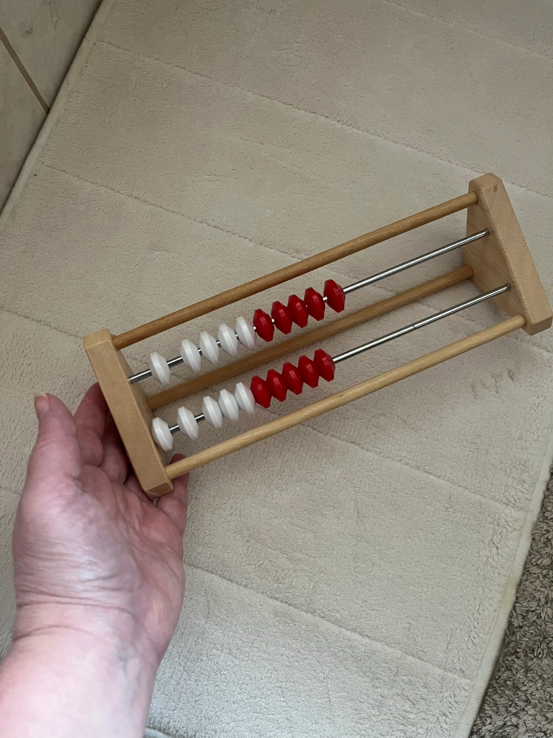 A classic wooden abacus with red and white beads!