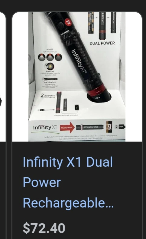 255This Infinity X1 flashlight is in good used condition and provides a powerful beam for any situation. I have used it for camping trips and other activities and it has never let me down. Features a durable design and multiple light modes. This thing is super bright! Almost new! Specifications: * Brand: Infinity * Model: X1 * Light Modes: High, Medium, Low, Strobe, SOS * Material: Aluminum Alloy Looking to get $50 for this amazing flashlight. Original price $72.40.