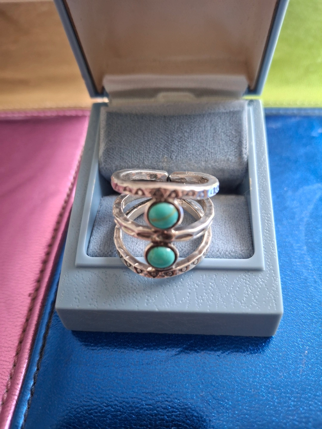 Silver ring (stamped 925) with 2 turquoise stones on 2 etched tiers. Never worn. Size 6.5. Available for pickup in Markland Wood.