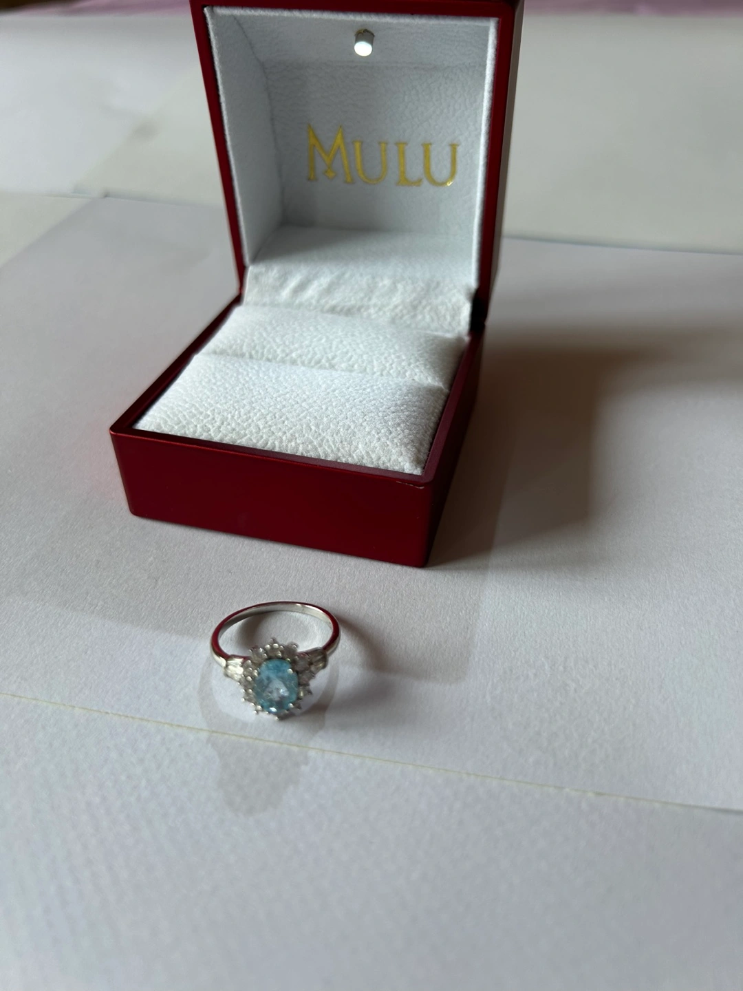 Selling a lovely ring from MULU, complete with its original box! This ring is in great condition and ready for a new home. Material is sterling silver (see stamp in third photo), and approximately size 7. March birthstone ring. Received as gift but does not fit.