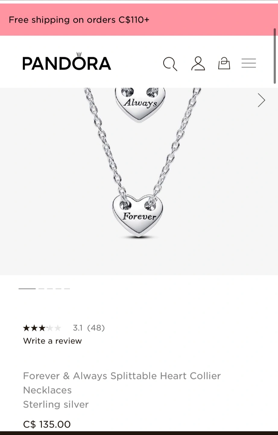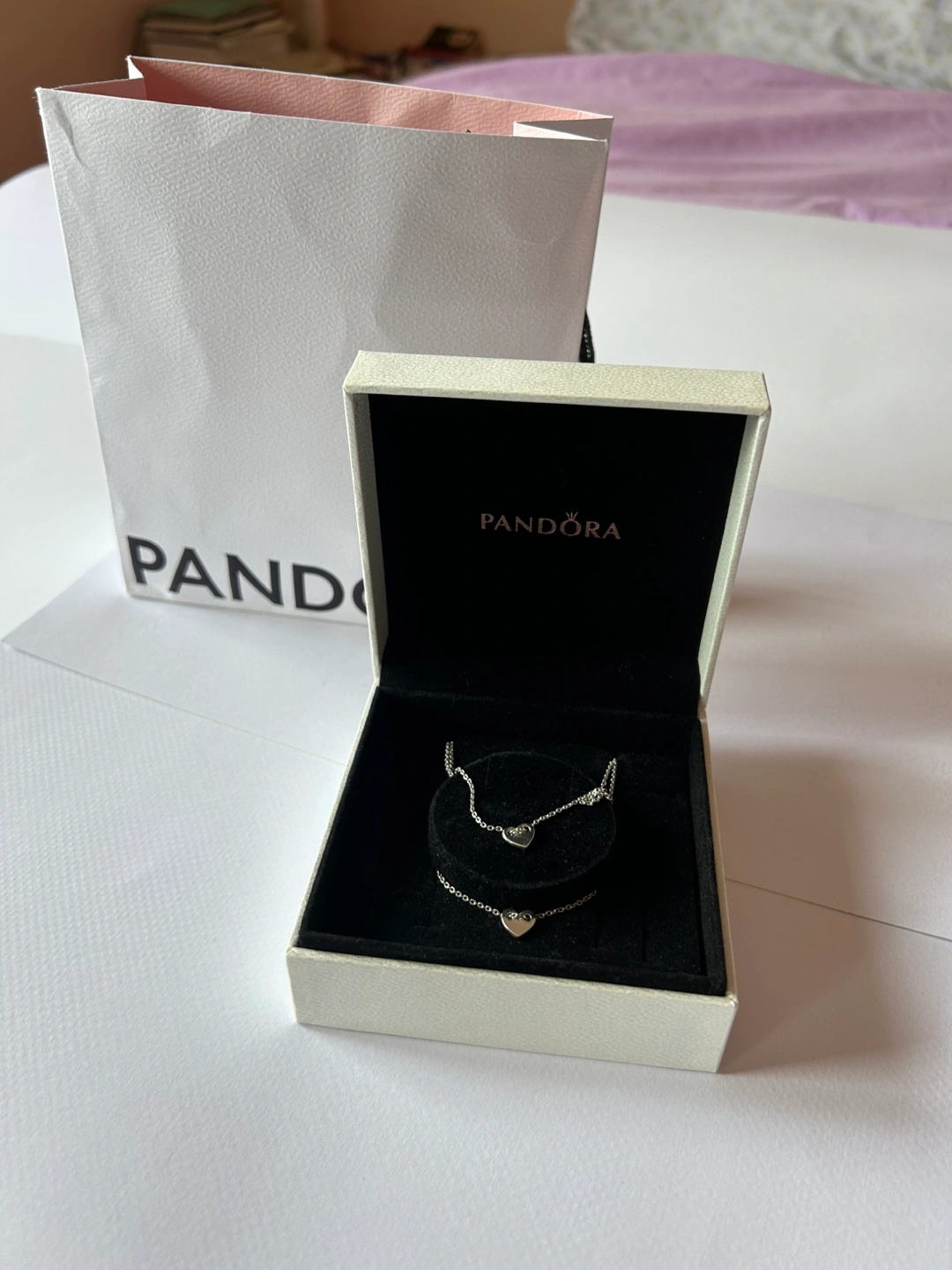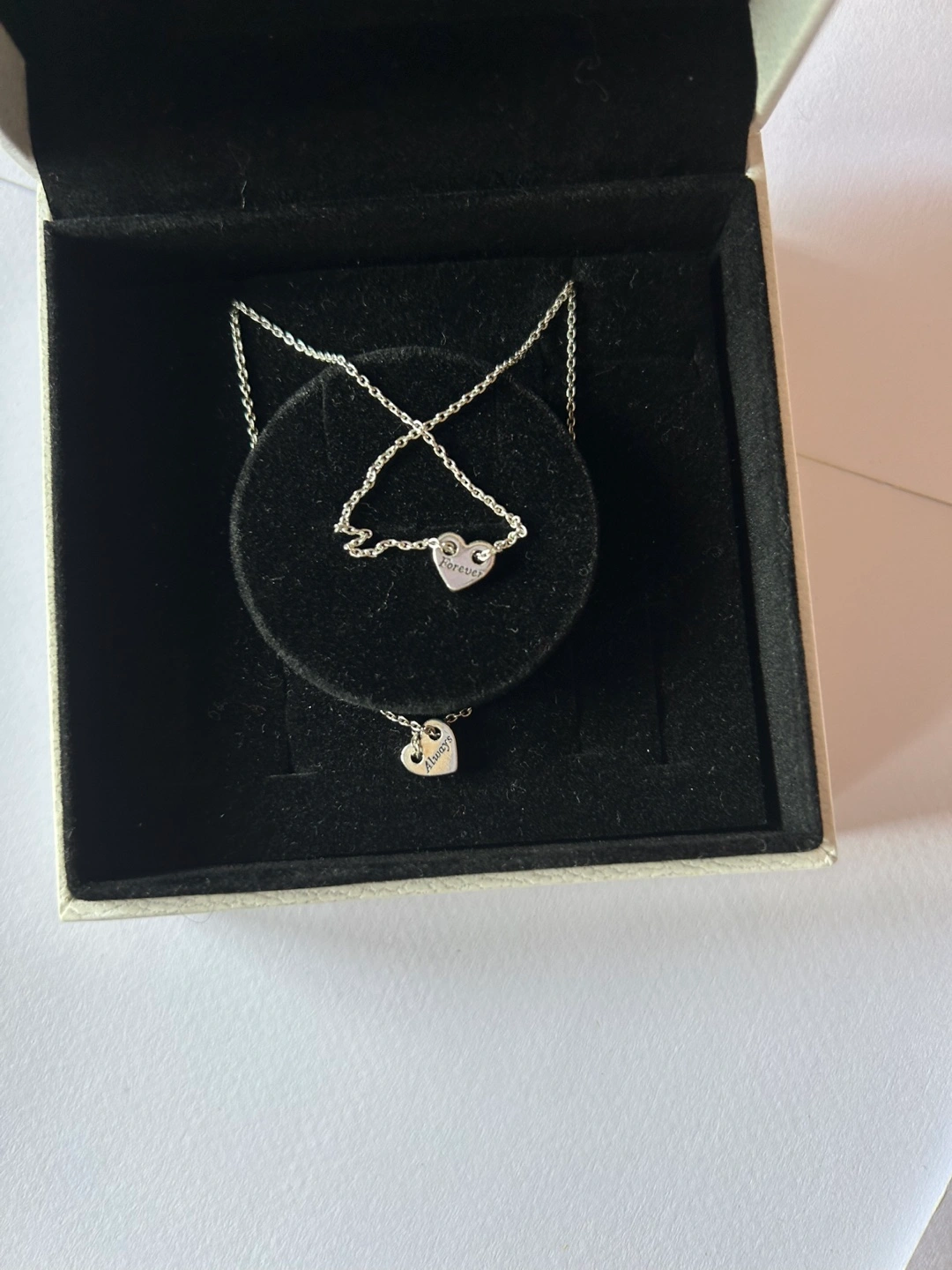 Selling a Pandora Forever & Always Splittable Heart Collier necklace. It's in great condition and comes with the original box and bag. The necklace is sterling silver and features two heart pendants, one with 'Forever' and the other with 'Always'. Originally bought for $135.