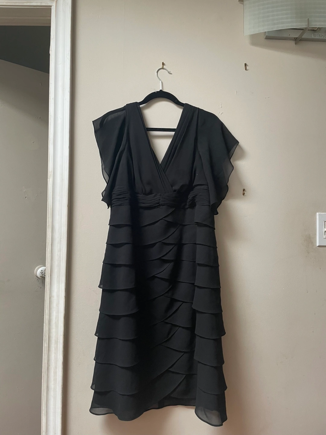 A lovely black dress from Michel Antoni Collection. It features a flattering V-neck and tiered design, perfect for a special occasion or evening out. It's in great condition and ready for a new home!