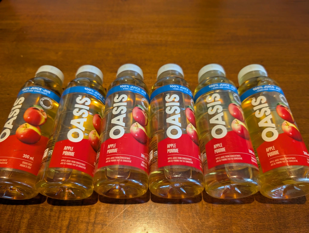 Selling six bottles of Oasis Apple Juice. Each bottle contains 300 mL of delicious apple juice from concentrate. $1 per unit or grab the 6 for $5 ❤️