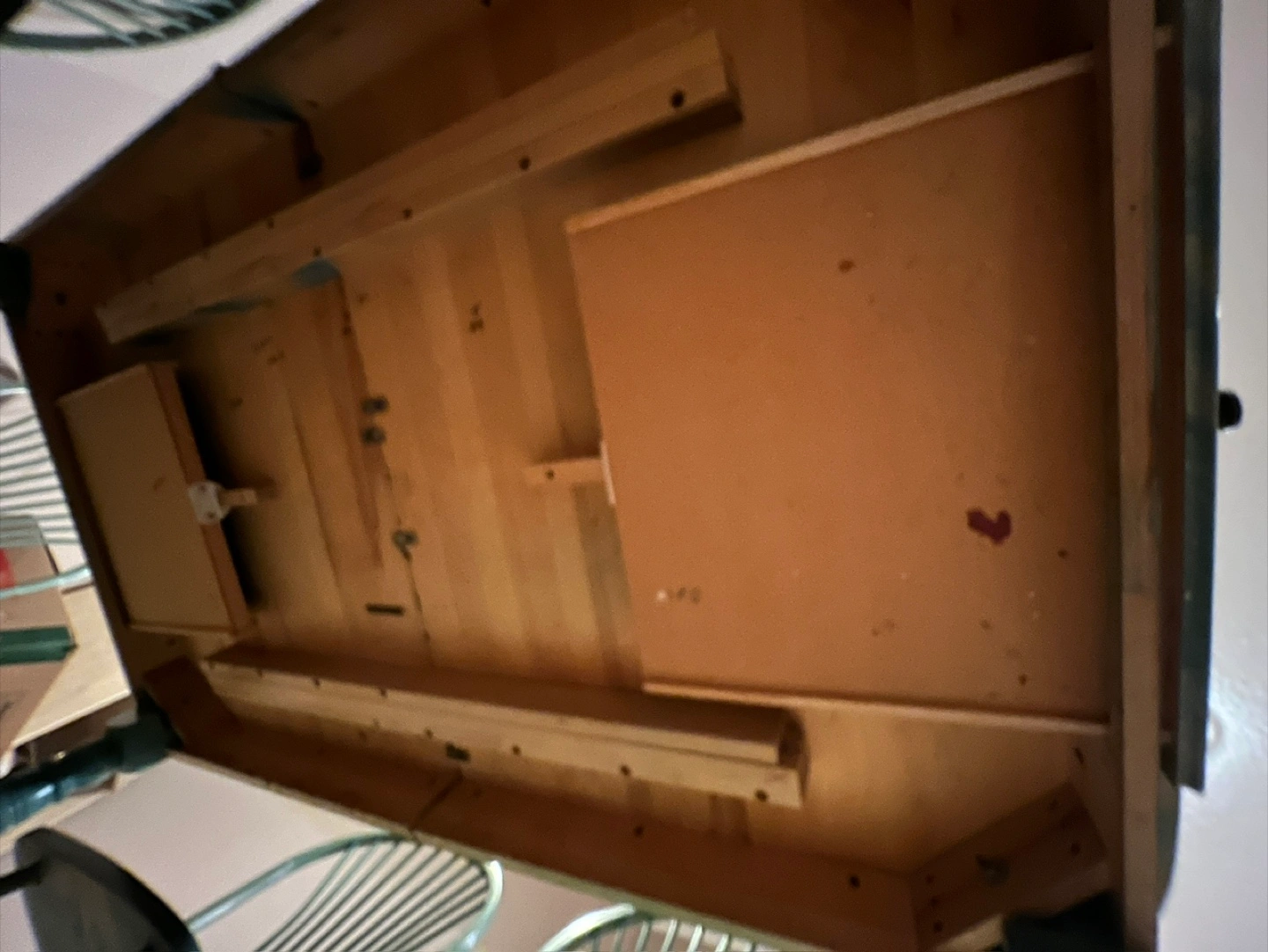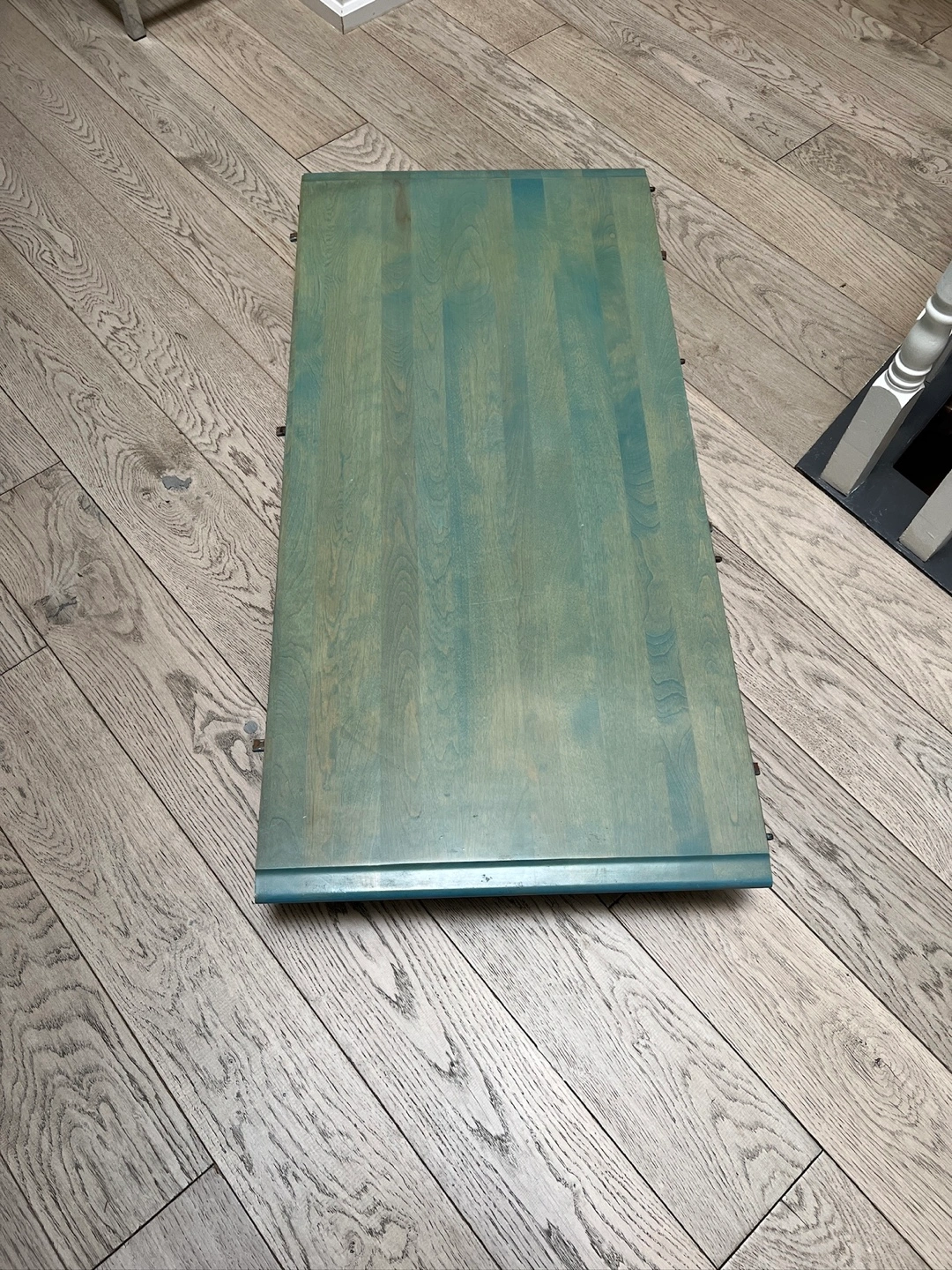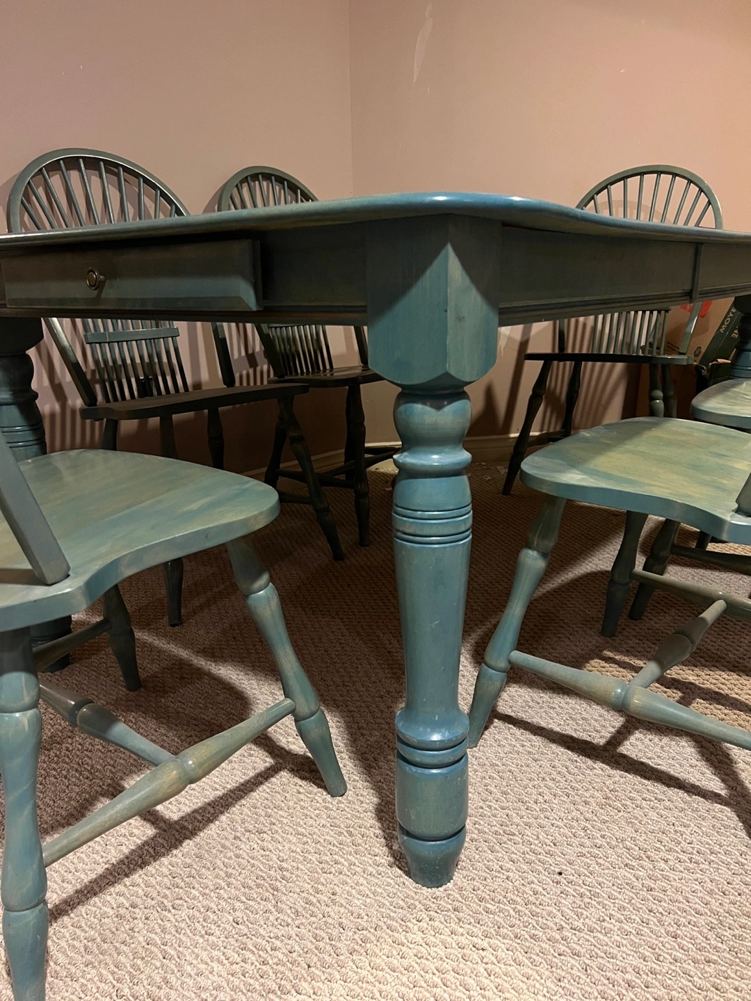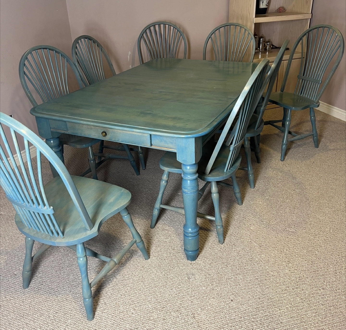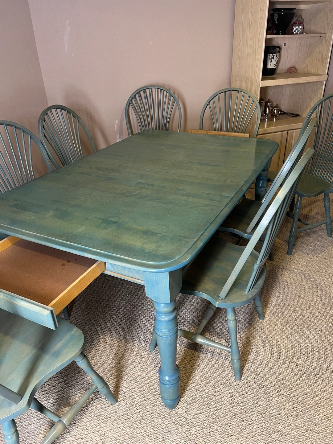 Sturdy and stylish farmhouse style solid wood dining set in a unique rustic green stain. Includes 8 matching chairs and a large rectangular table with turned legs, plus a 20” extension leaf for extra seating when entertaining. The table is solid beautiful and very well made. It has some surface marks that can be refinished for a stunning like-new look. Details • Table dimensions: 64” L × 42” W × 30” H (extends to 84” L with leaf) • Leaf width: 20” • Chair dimensions: 16” L × 19.5” W (seat width) • Solid wood construction – durable and long-lasting • Rustic farmhouse-style finish • Two built-in drawers for added storage Condition: Good used condition. Surface wear consistent with age and use. Solid and stable – ready for everyday dining or entertaining.