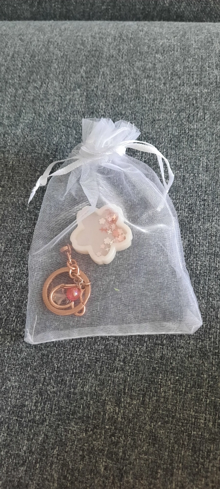 Here's a cute set with a rose gold keychain and a flower pin! They come in a little white drawstring bag, perfect for gifting or just keeping them safe. The keychain has a unique design with a little red bead, and the flower pin has sparkly details that catch the light. They would be a great addition to your collection or a sweet gift for someone special. Pick up only, cash only.