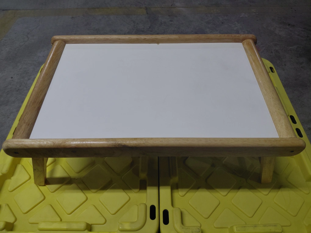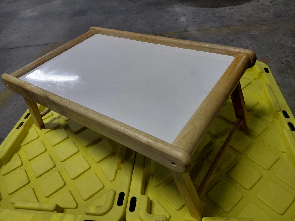 Wooden bed tray table for breakfast in bed or working from the couch. Wood finish and a smooth white surface. Some slight damage at top, chip in white surface. In good gently used condition.