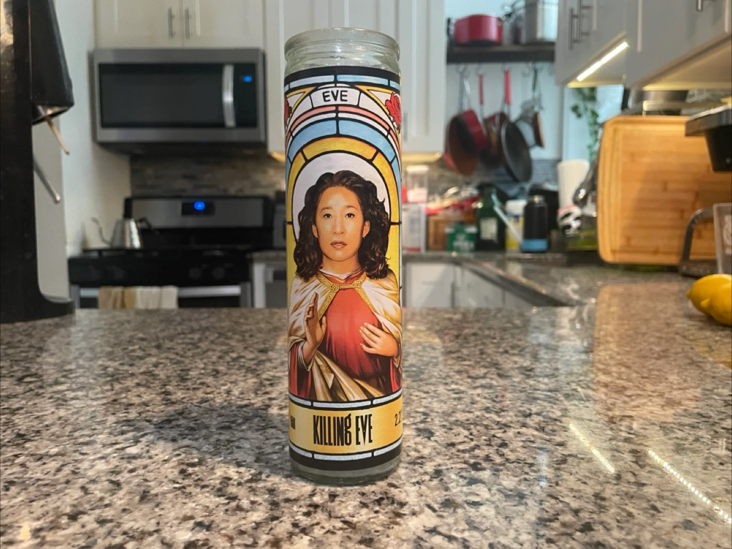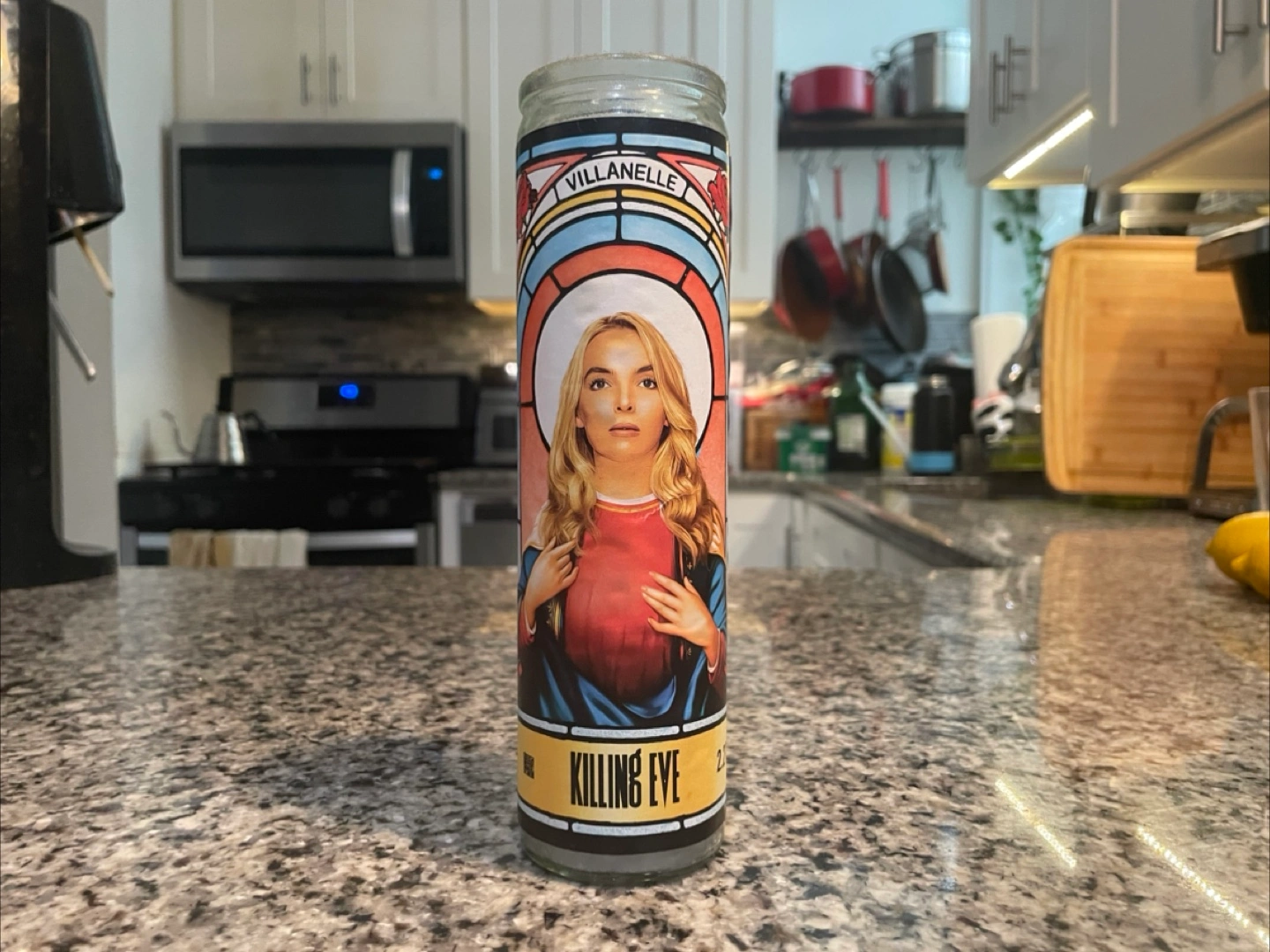 Selling a Killing Eve prayer candle featuring Villanelle and Eve. This is official swag from AMC, sent to press for the final season.