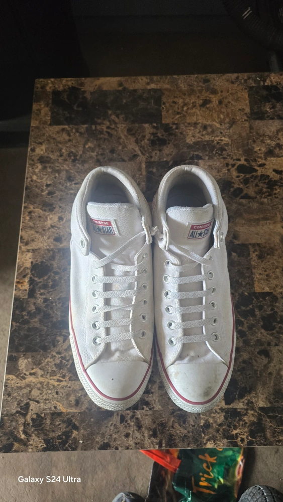 Selling a pair of Converse All Star sneakers in white. They're in used condition, with some signs of wear as shown in the pictures. Size is US men's 11, UK 11, EUR 45, and 29.5 cm. The upper is textile and the outsole is rubber.