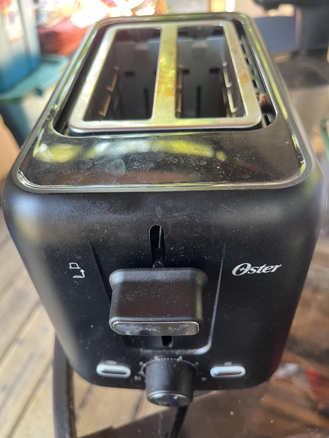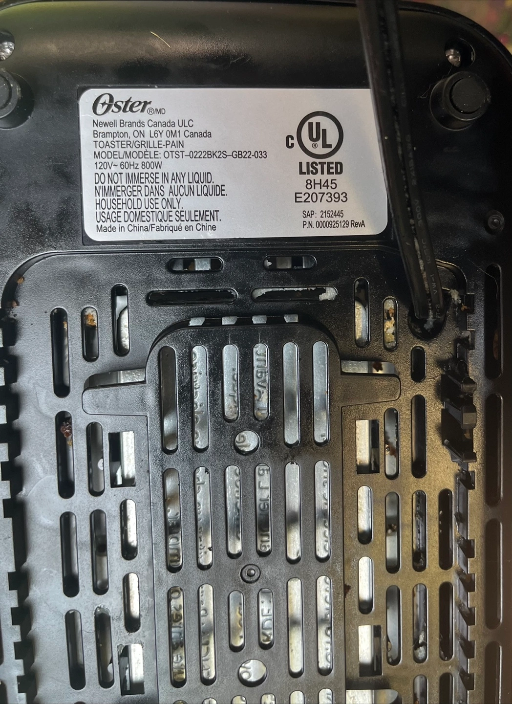 58Selling a used Oster toaster. The model number is OSTST-02222BK2S-GB22-033. It operates at 120V, 60Hz and 800W. It's in used condition, as you can see in the pictures, but it still works!