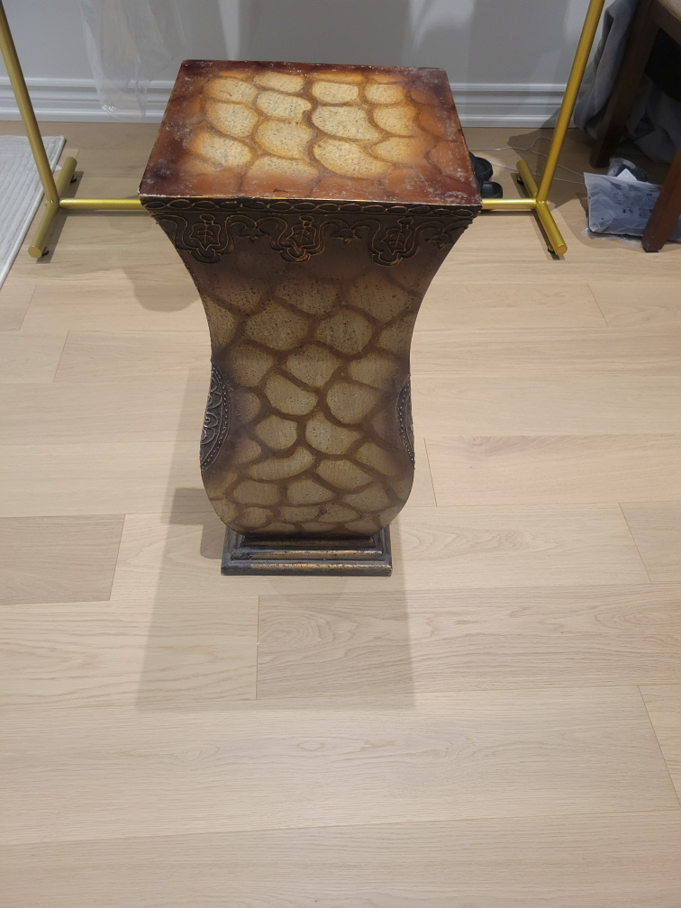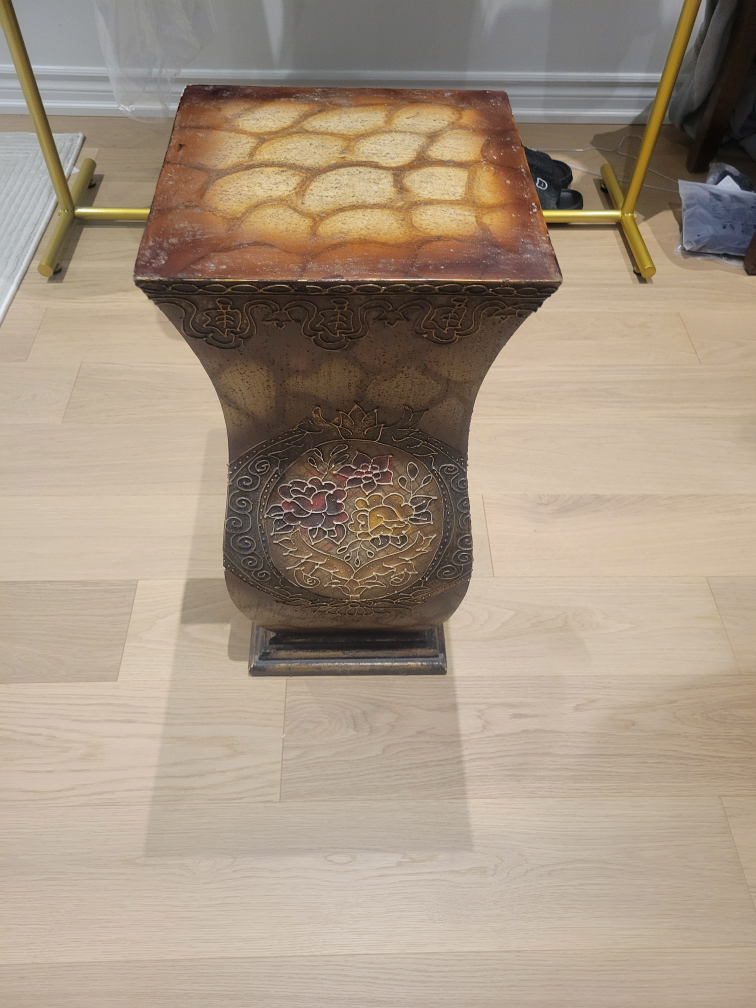 Selling a decorative accent table with a unique floral design. It's in great condition and would look lovely in any room! The table has a square top with a faux stone pattern and a vase-shaped body with intricate detailing.