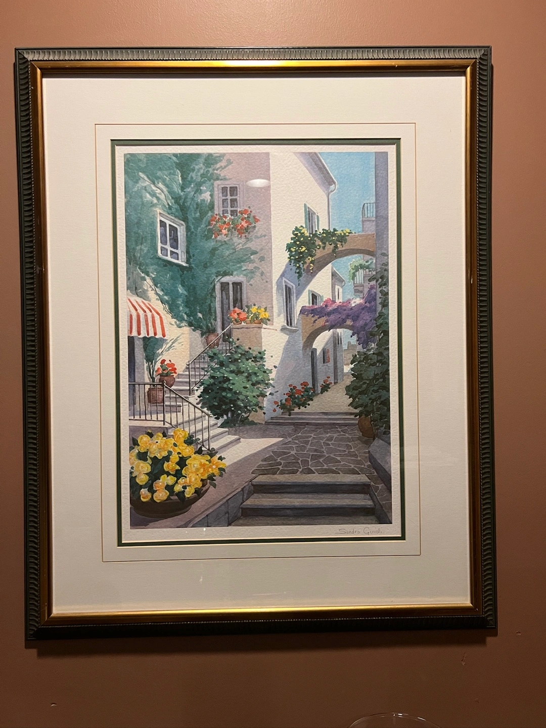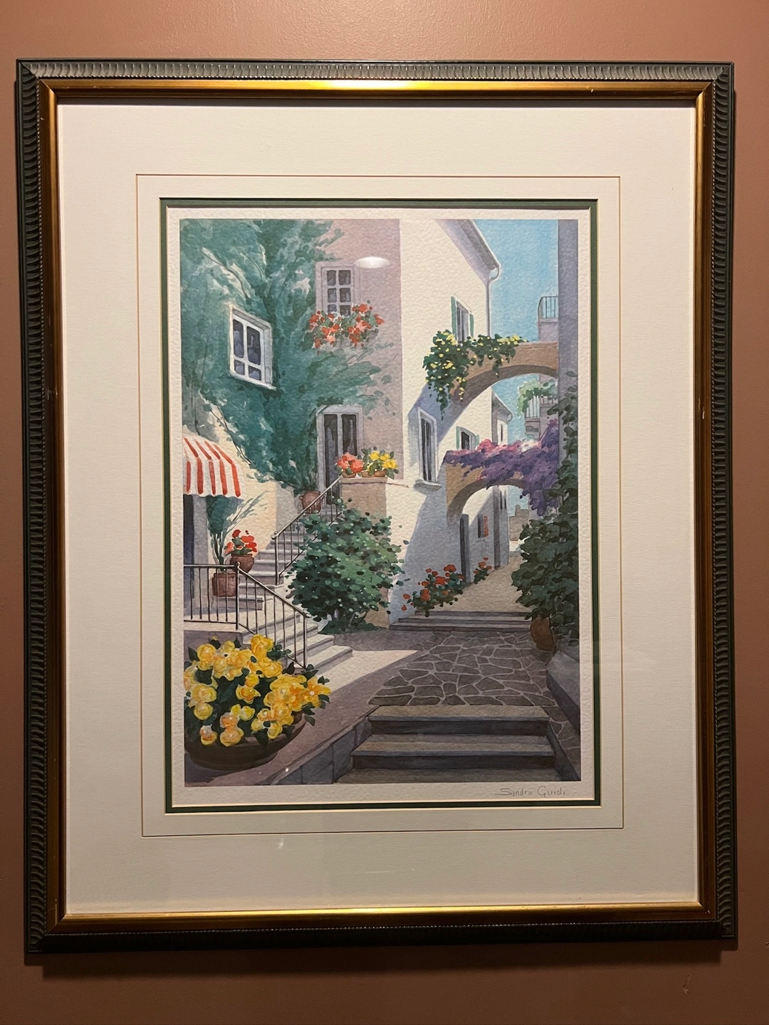 Beautiful signed print by artist Sandro Guidi, featuring a colorful Mediterranean street scene. Double-matted and framed behind glass, ready to hang.
