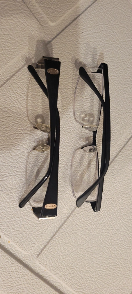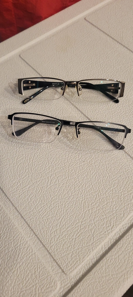 Selling two pairs of eyeglasses. One is a full frame and the other is a half frame. Both are in good condition and ready for new lenses!