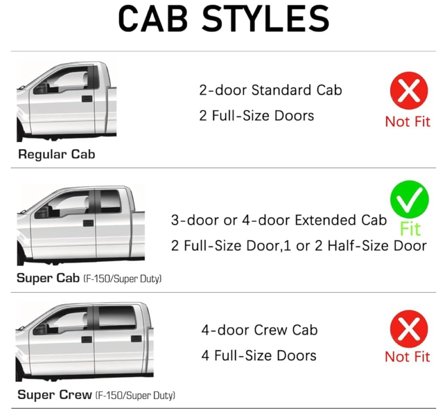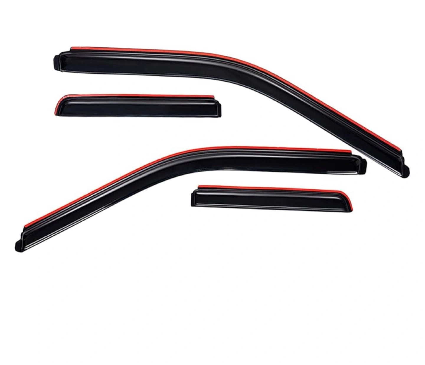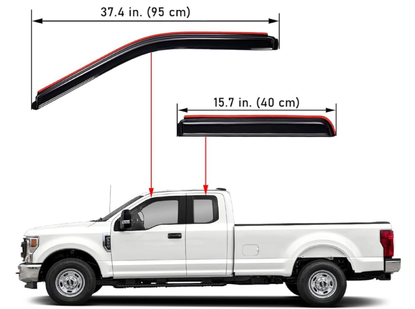 Selling a set of window visors designed for a Ford F-150 Super Cab pickup truck. These visors are designed to fit the 3-door or 4-door Extended Cab models. They have a sleek black finish with a red accent stripe. The longer visors measure approximately 37.4 inches (95 cm), and the shorter ones are about 15.7 inches (40 cm).