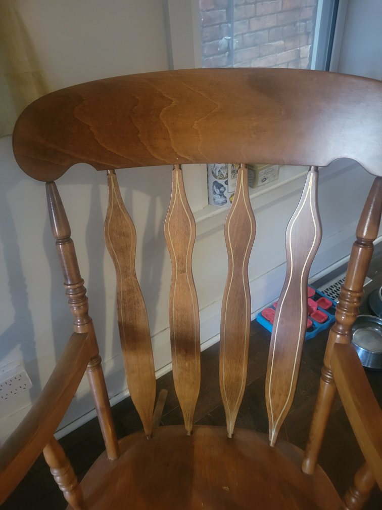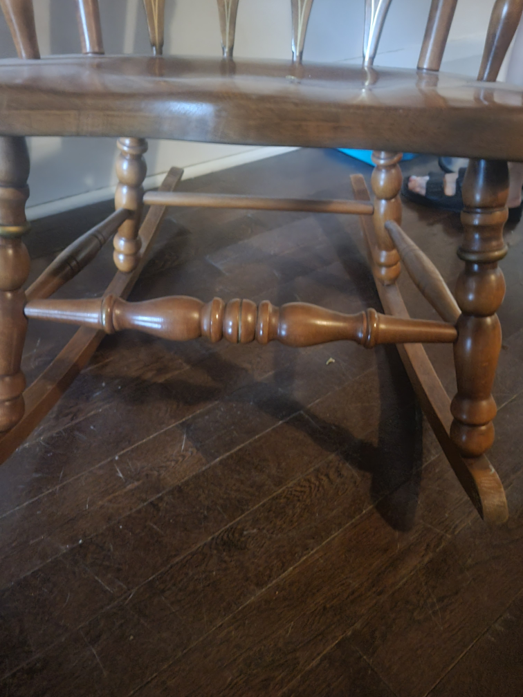 Selling a lovely wooden rocking chair. It's a classic piece that would look great in any home. The chair is in good condition and ready for a new owner to enjoy!