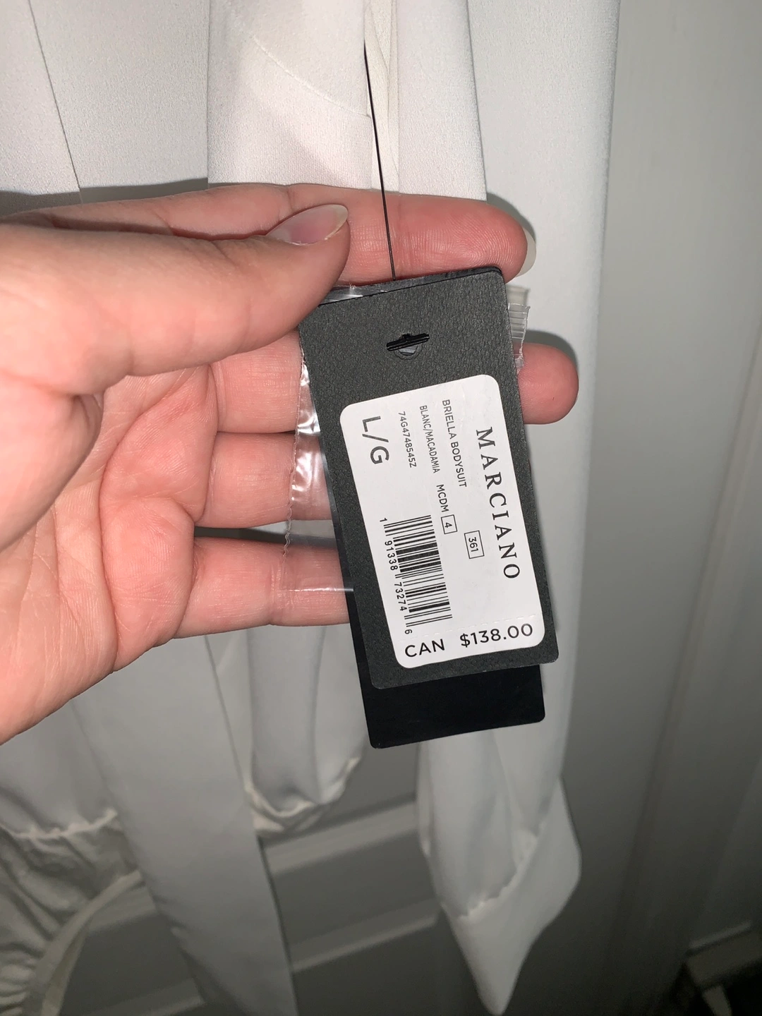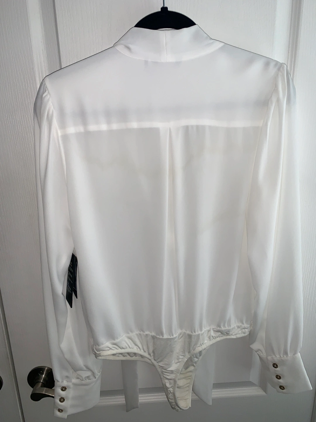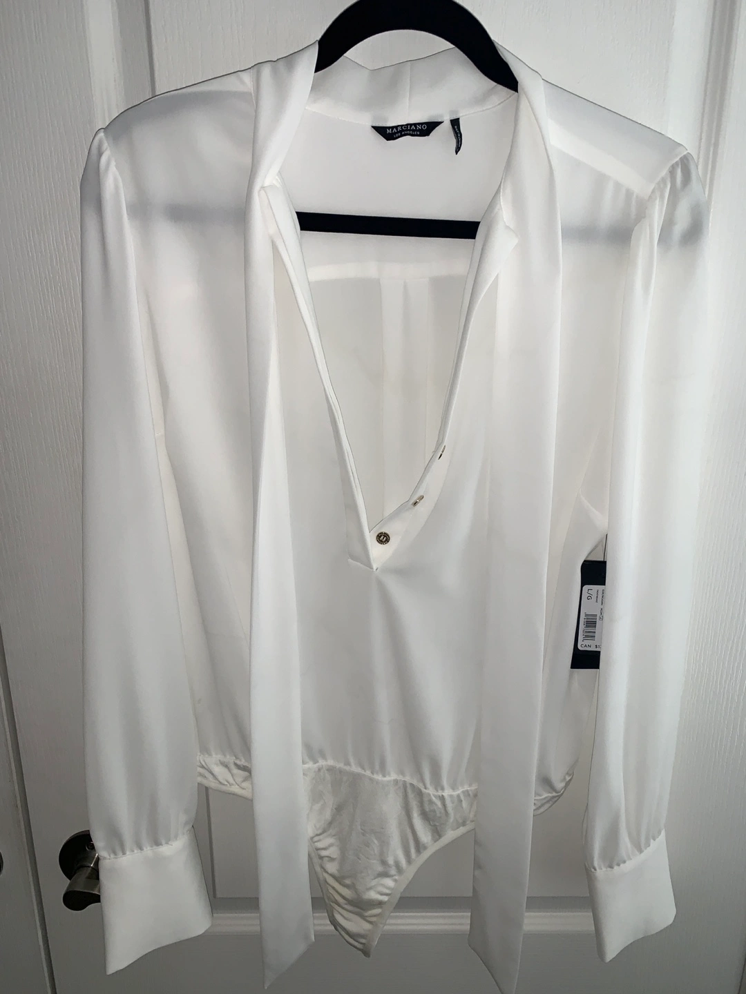 Selling a Marciano long sleeve bodysuit, size Large, in white. It features a tie neck and button details. Perfect for dressing up or down!