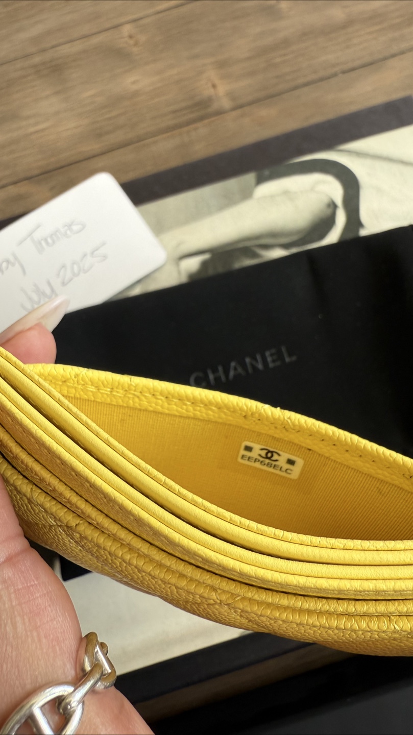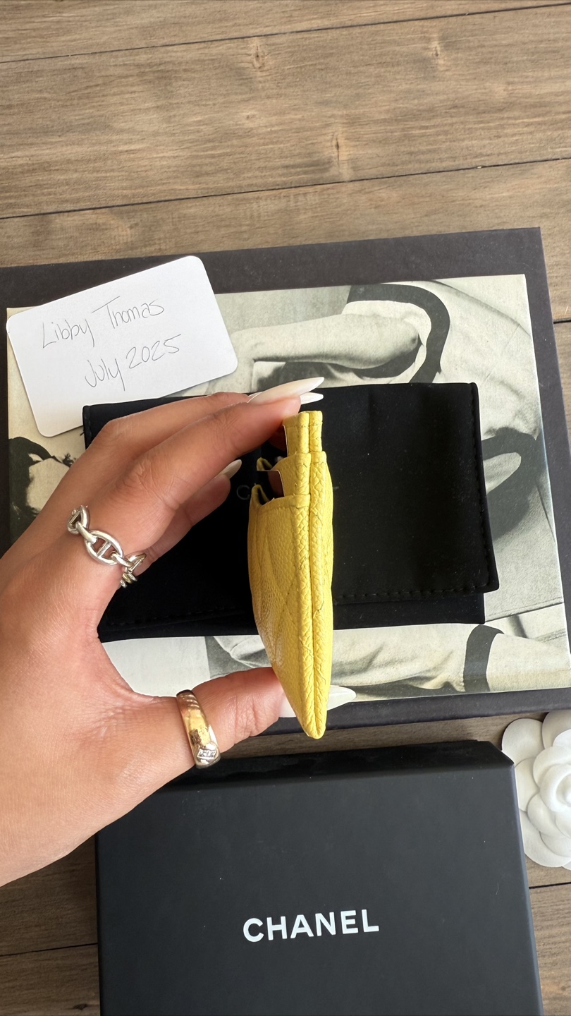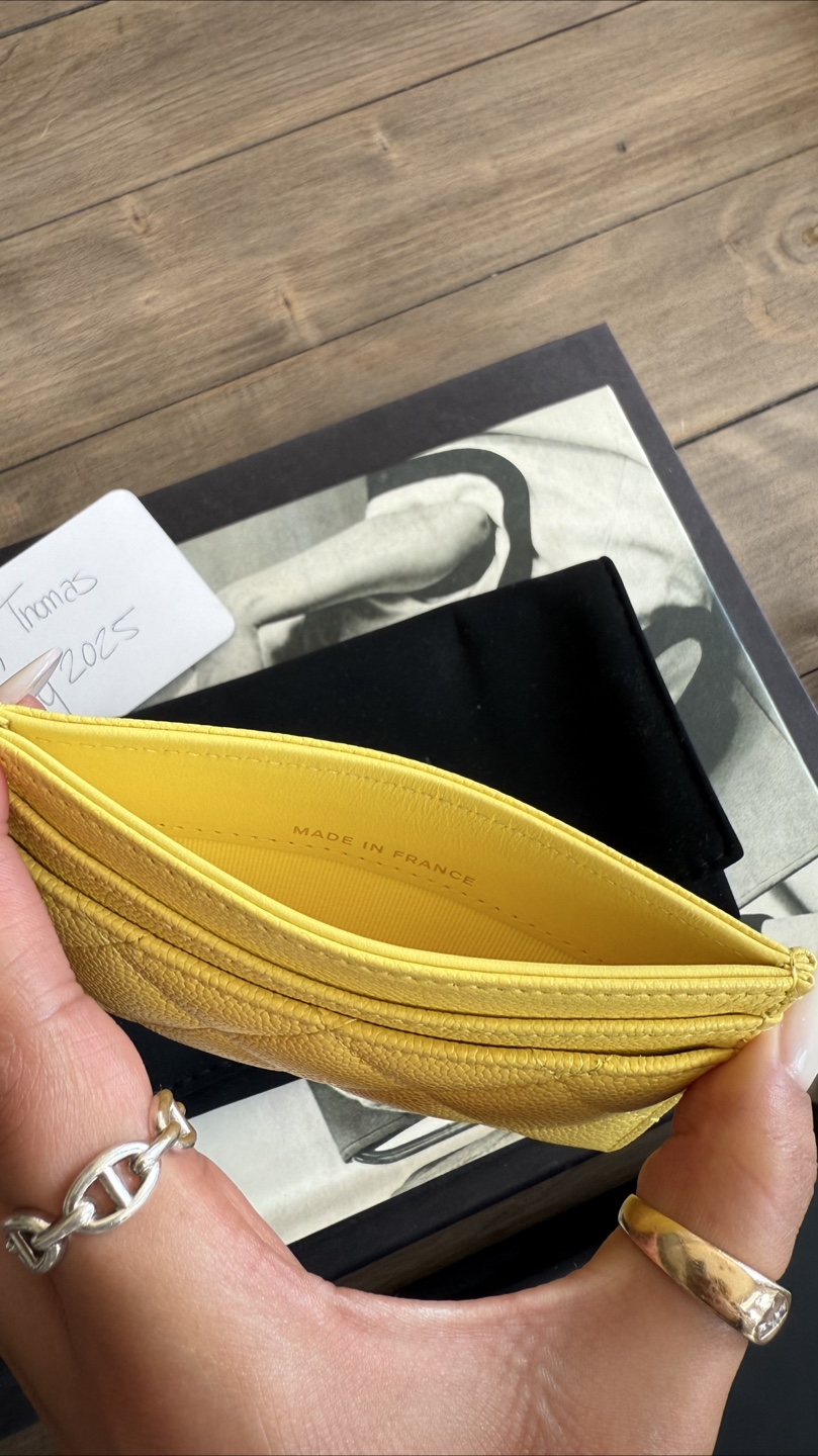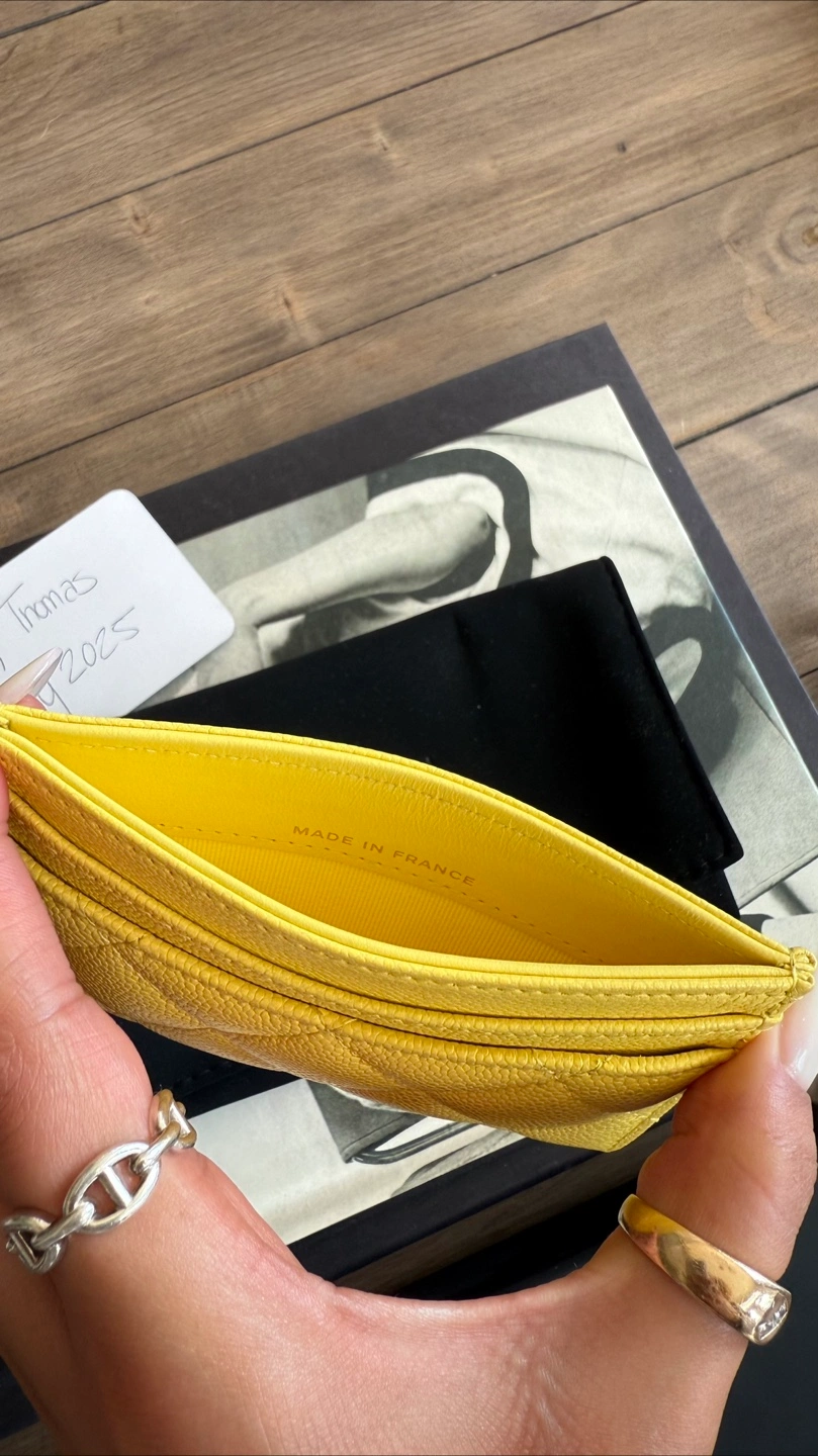 Bright yellow 24S card holder with iconic quilted pattern! I purchased this directly from Chanel in Bergdorf Goodman NYC.