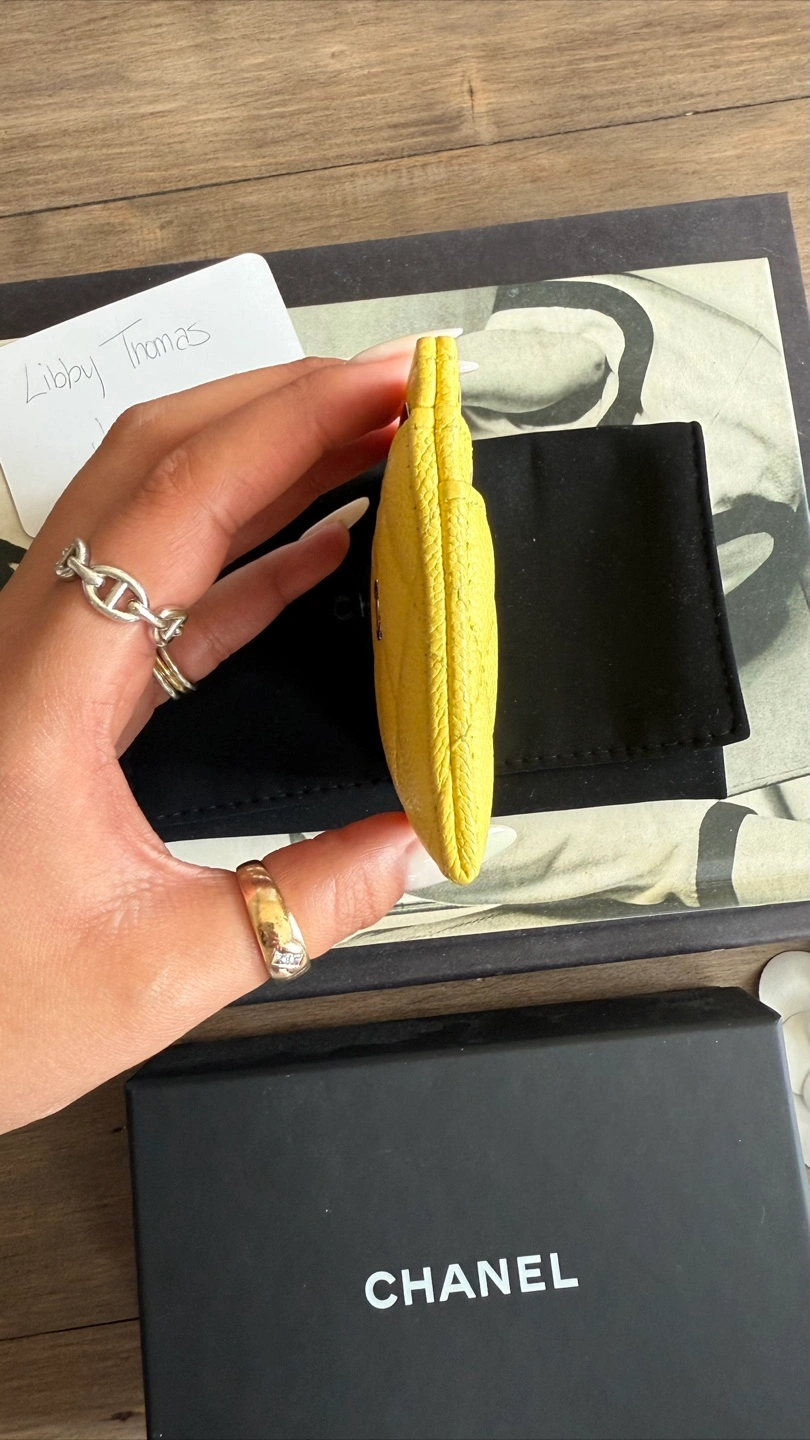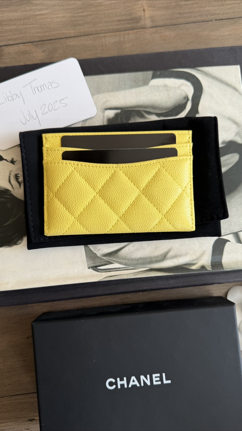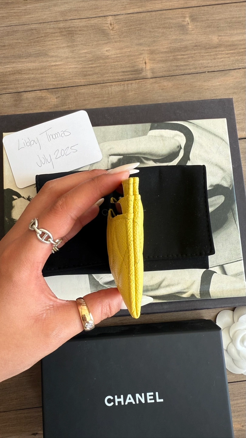 Bright yellow 24S card holder with iconic quilted pattern! I purchased this directly from Chanel in Bergdorf Goodman NYC.