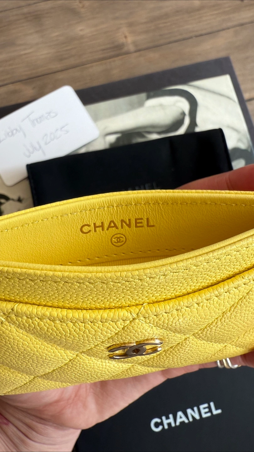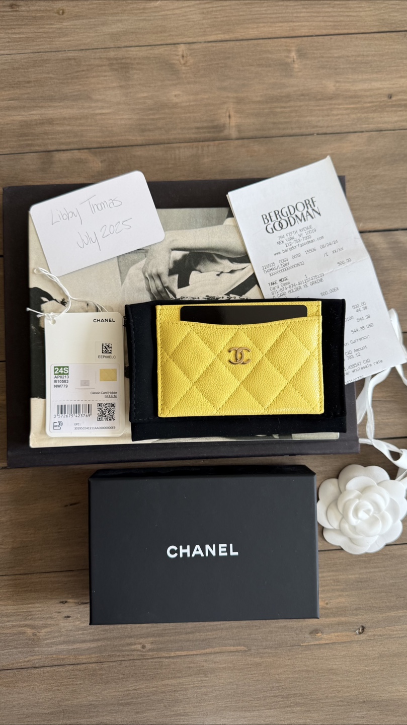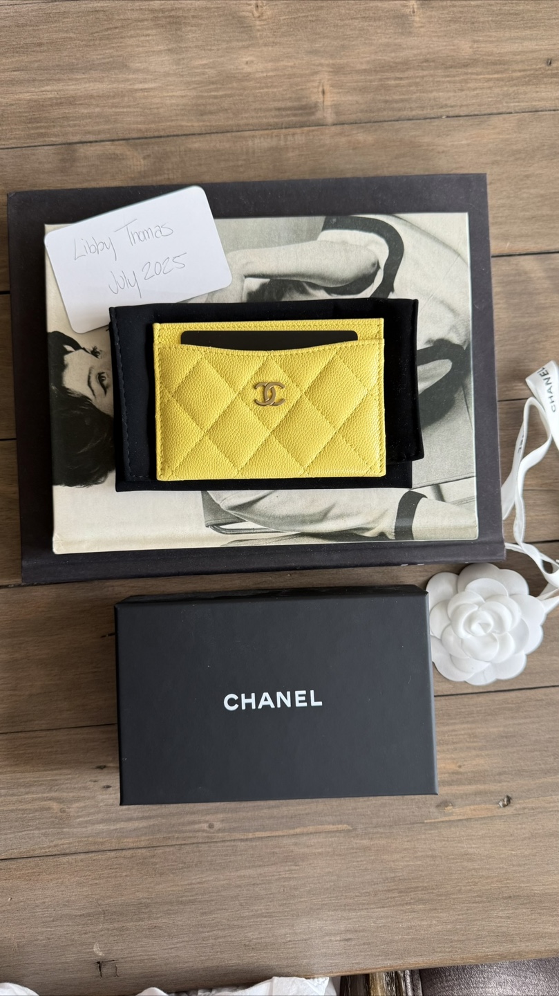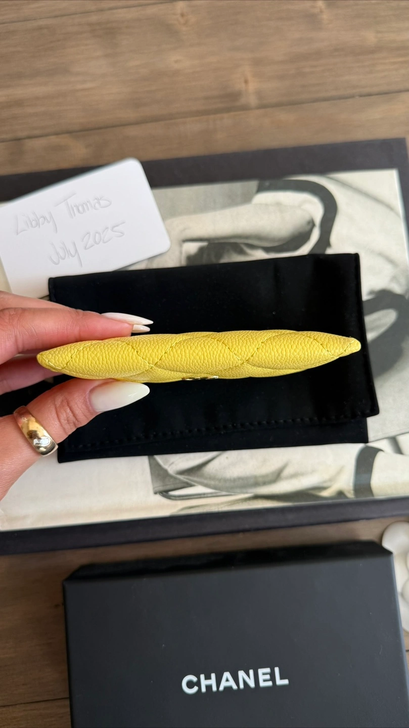 Bright yellow 24S card holder with iconic quilted pattern! I purchased this directly from Chanel in Bergdorf Goodman NYC.