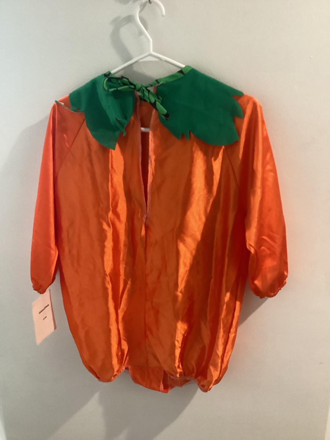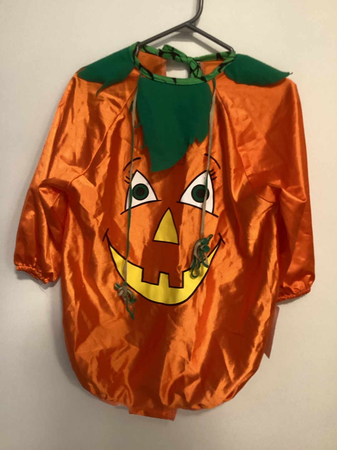 Here's a cute pumpkin costume! It's orange with green leafy details around the neck and a friendly face on the front. Perfect for Halloween or dress-up!
