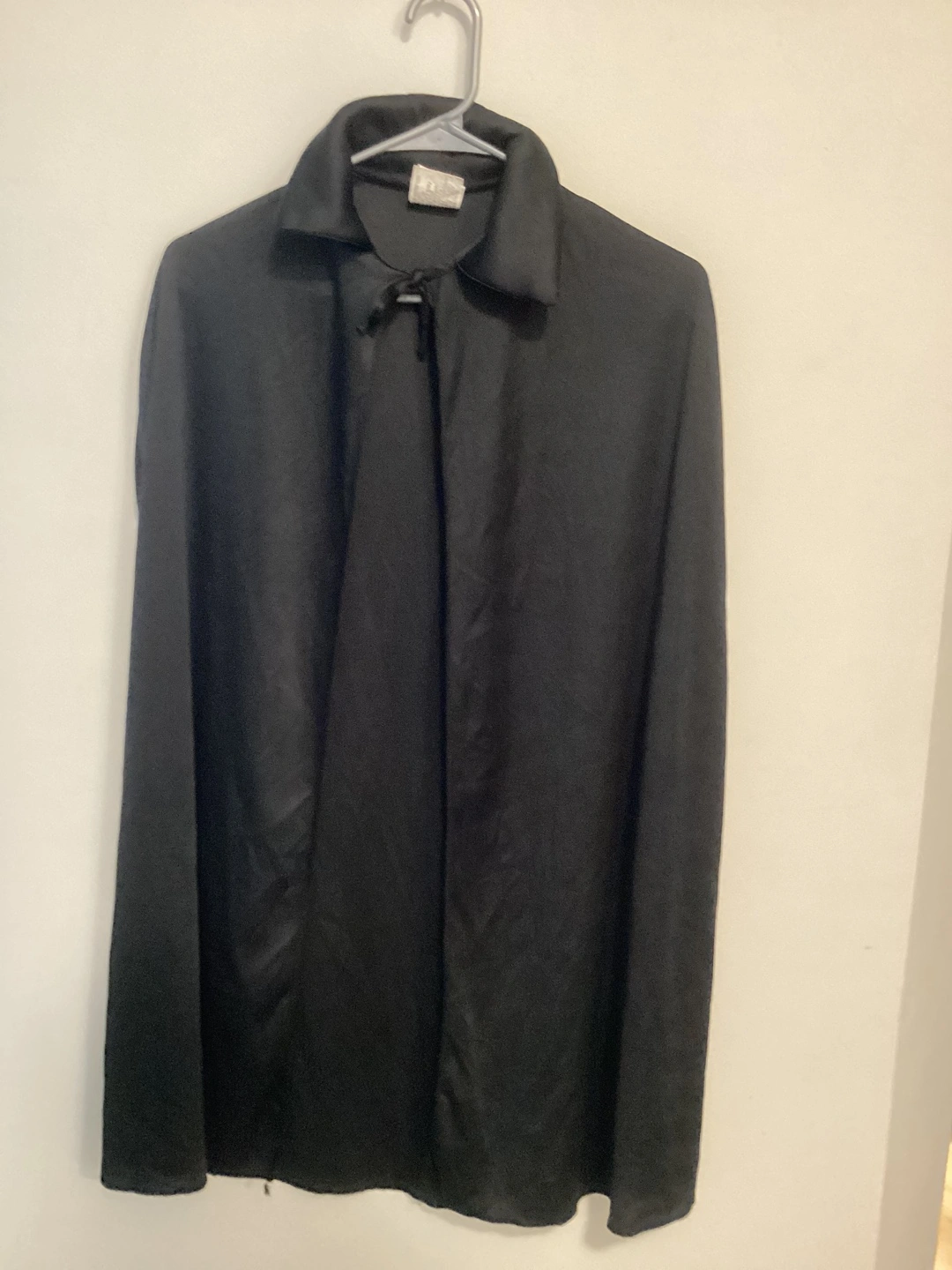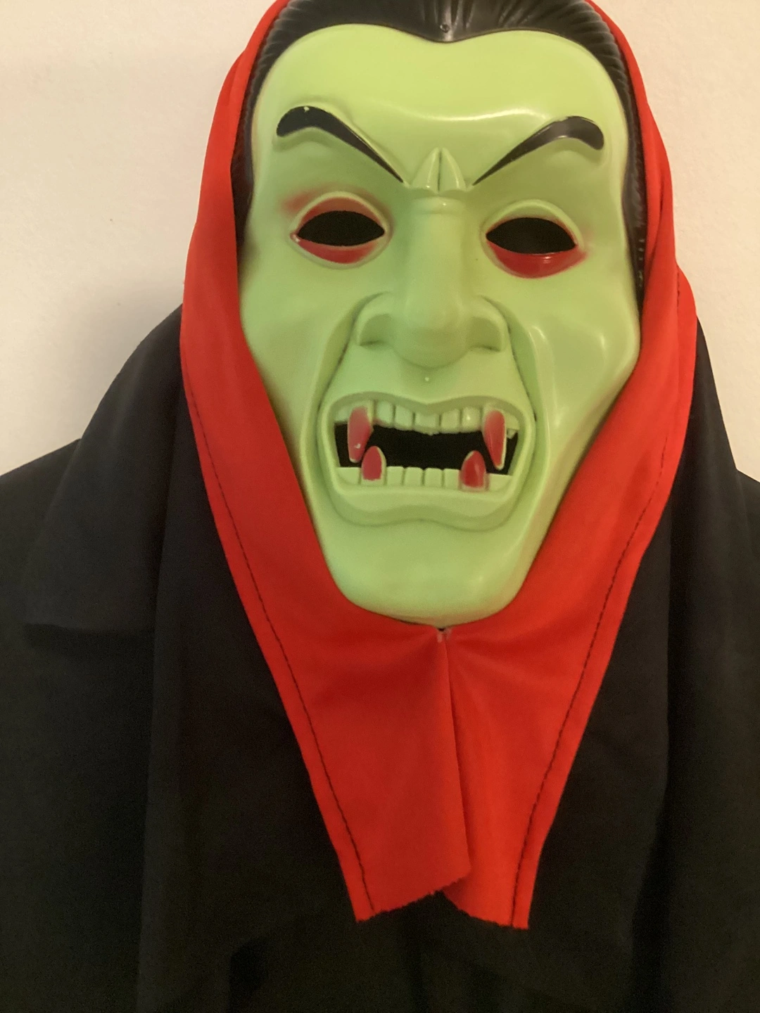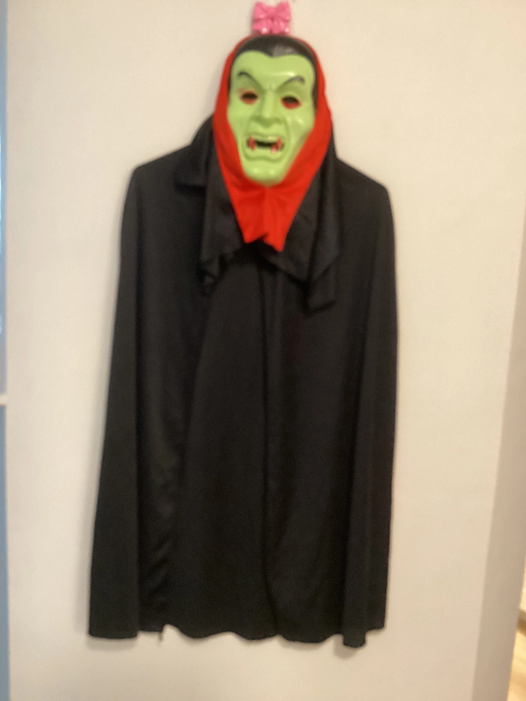 Selling a vampire costume, perfect for Halloween or dress-up! It includes a black cape and a green vampire mask with red accents. Great for kids or adults who want a classic vampire look