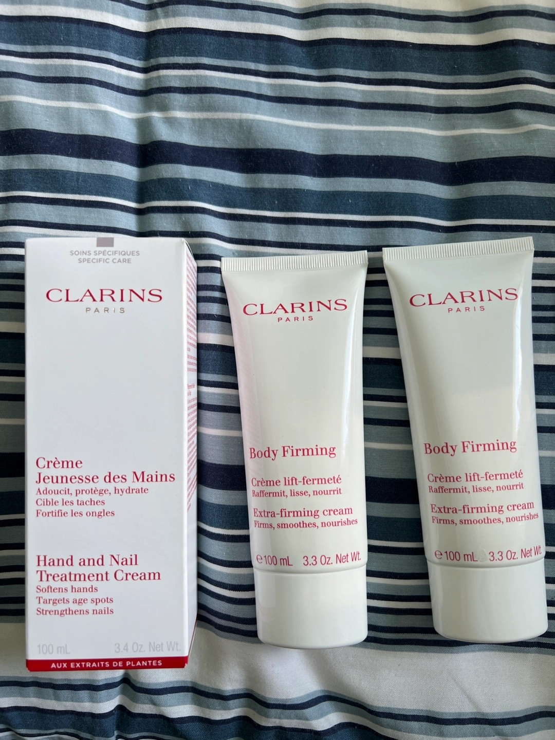 Selling a trio of Clarins creams! This includes one box of Crème Jeunesse des Mains Hand and Nail Treatment Cream (100 ml) and two tubes of Body Firming Crème (100 ml each). Great for softening hands and moisturizing your body.