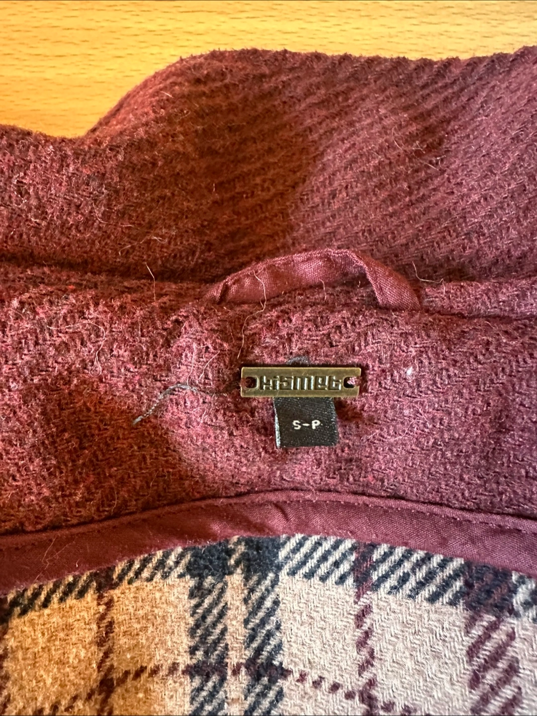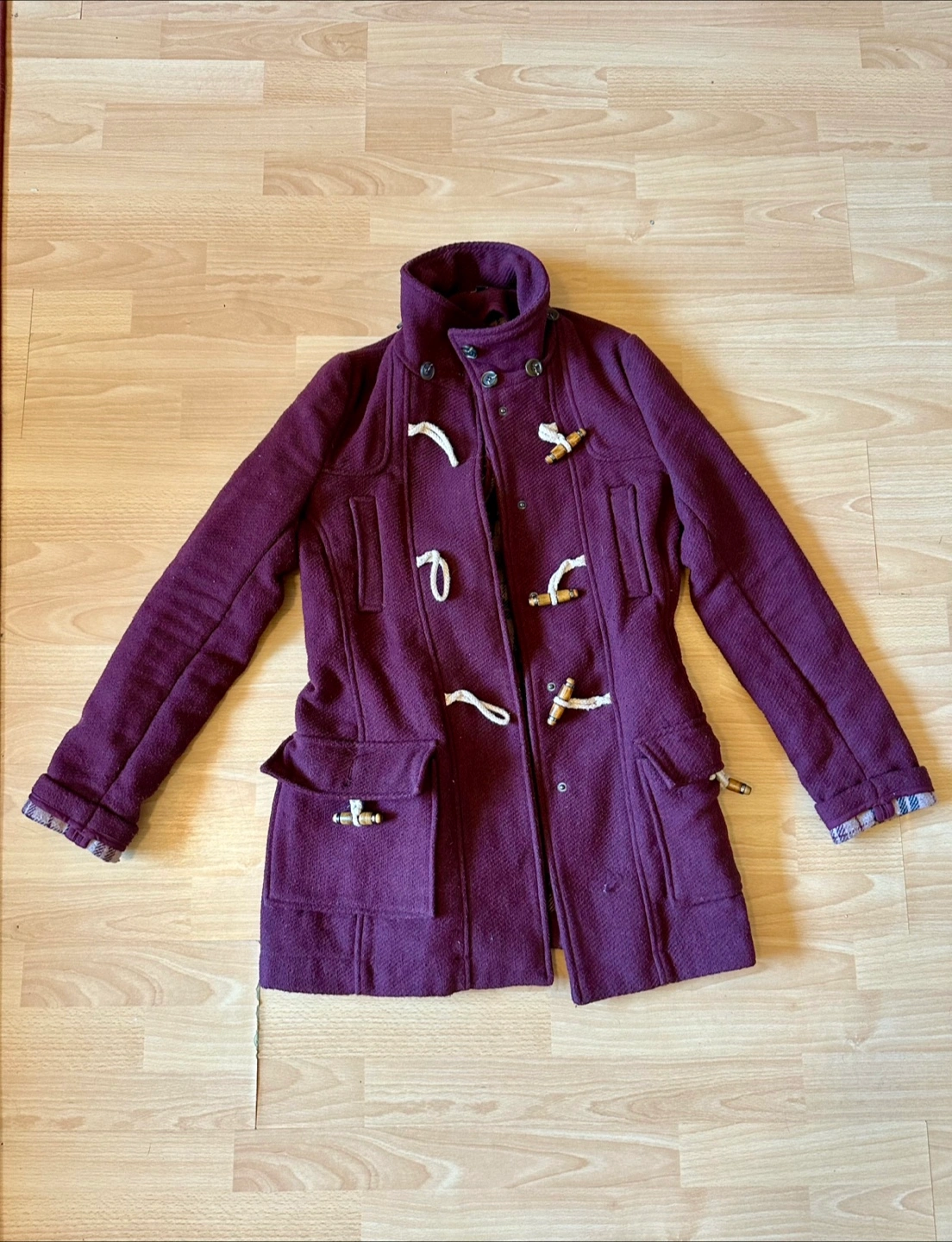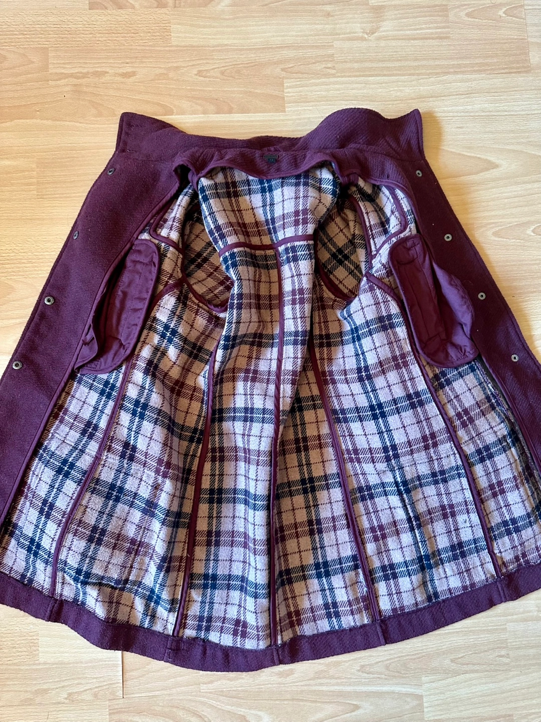 Selling a Burgundy winter coat with tan colored plaid lining. Material is a wool blend, and is very warm in the winter. Coat features real wood fasteners, and 4 functional pockets. Hood attachment is unfortunately missing. Originally from Bootlegger