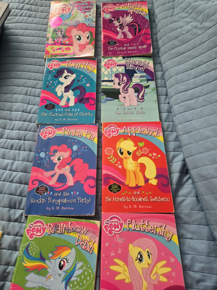 Selling a set of 8 My Little Pony books for kids. Each book features a different pony and story, including Twilight Sparkle, Rarity, Pinkie Pie, Applejack, Rainbow Dash, and Fluttershy. Great for young readers!
