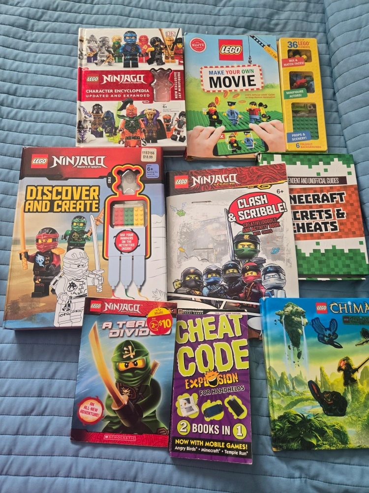 Selling a collection of LEGO Ninjago and Minecraft books! Great for kids who love building and gaming. Includes: $5 each or all for $20