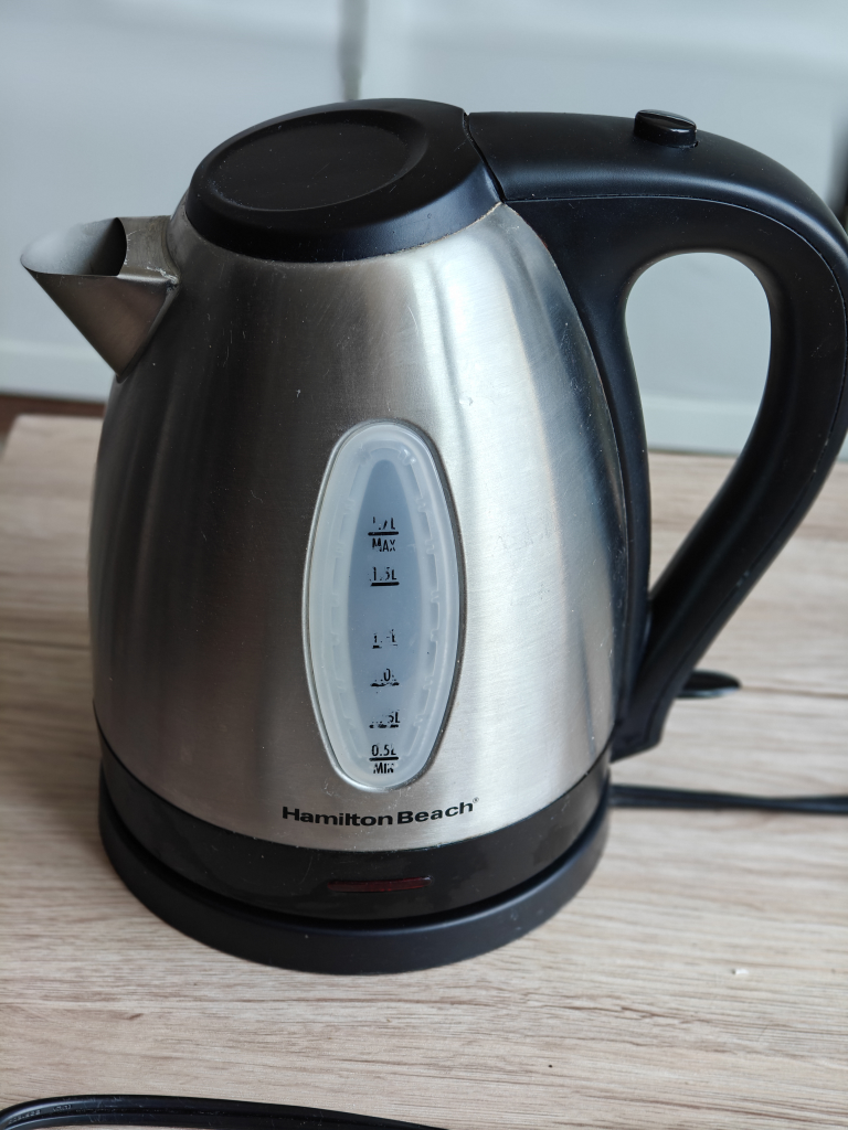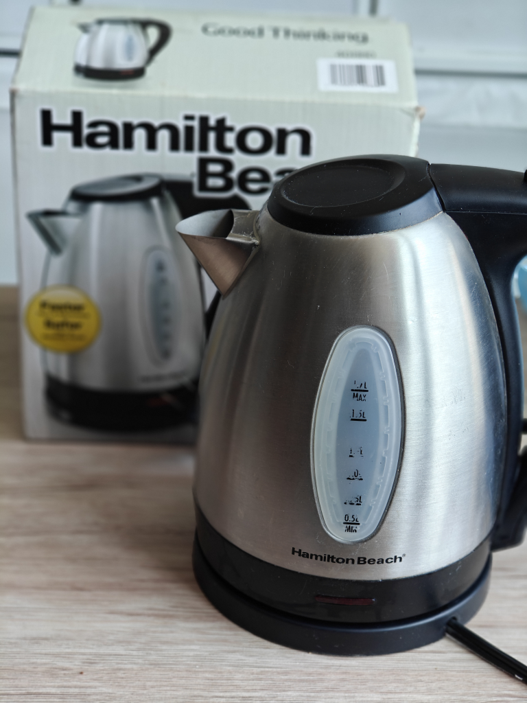 I'm selling a Hamilton Beach electric kettle with box in good condition! It features a water level window to easily see how much water is inside. The kettle is stainless steel with black accents. It has a capacity of 1.7L.