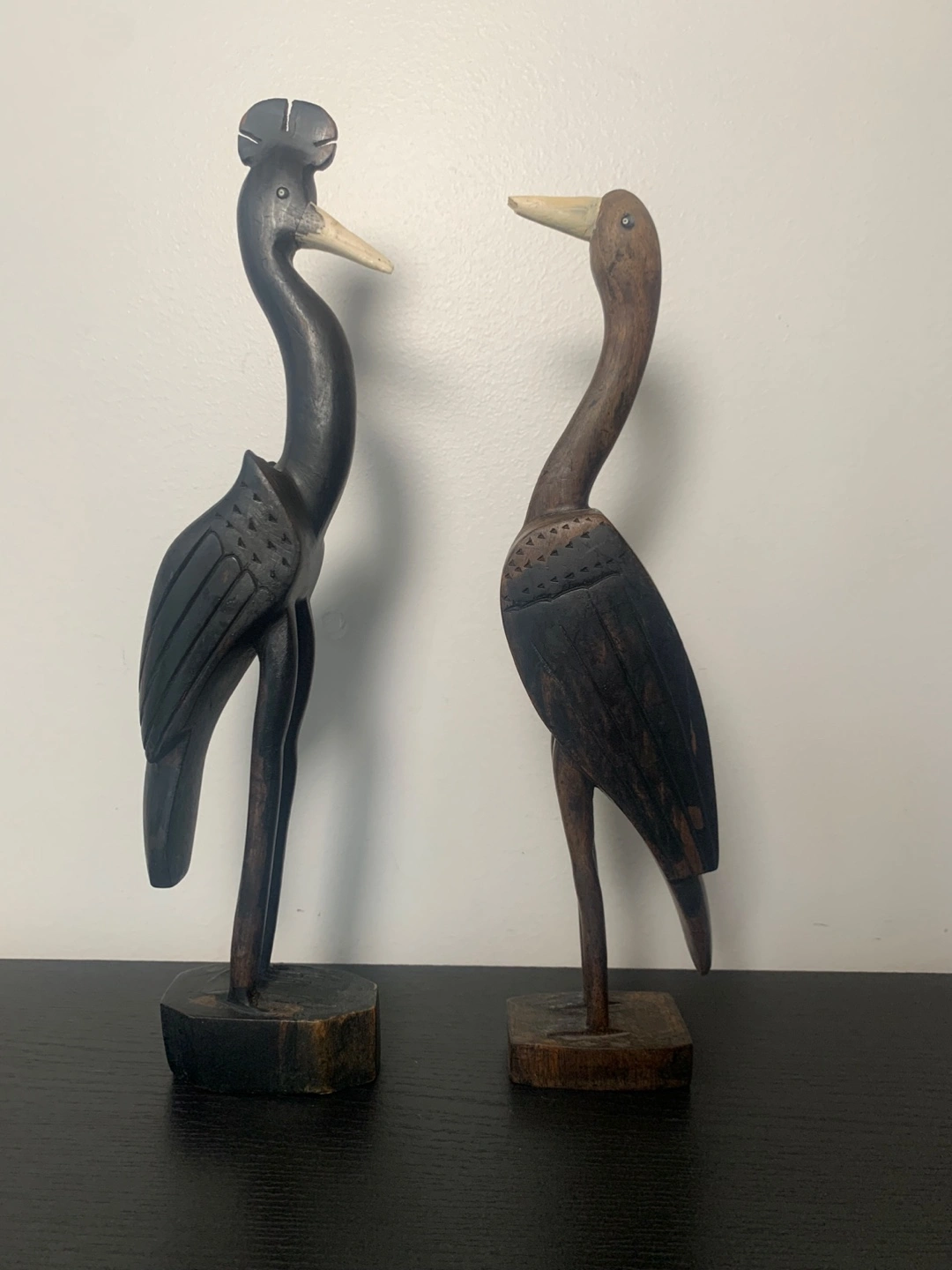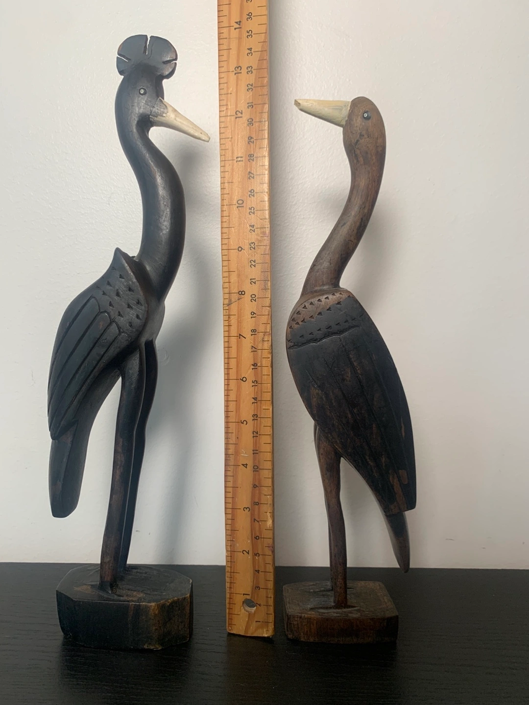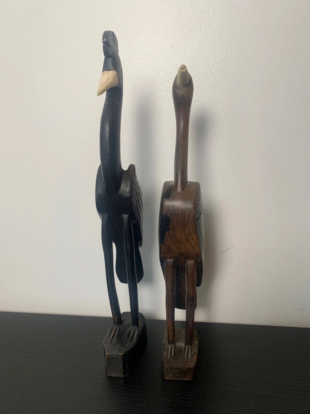 Selling a pair of vintage African hand-carved wooden bird sculptures! One is a darker wood than the other. They might be cranes. The smaller bird has a small chip on the end of her beak. They stand about 14 and 12.5 inches tall.