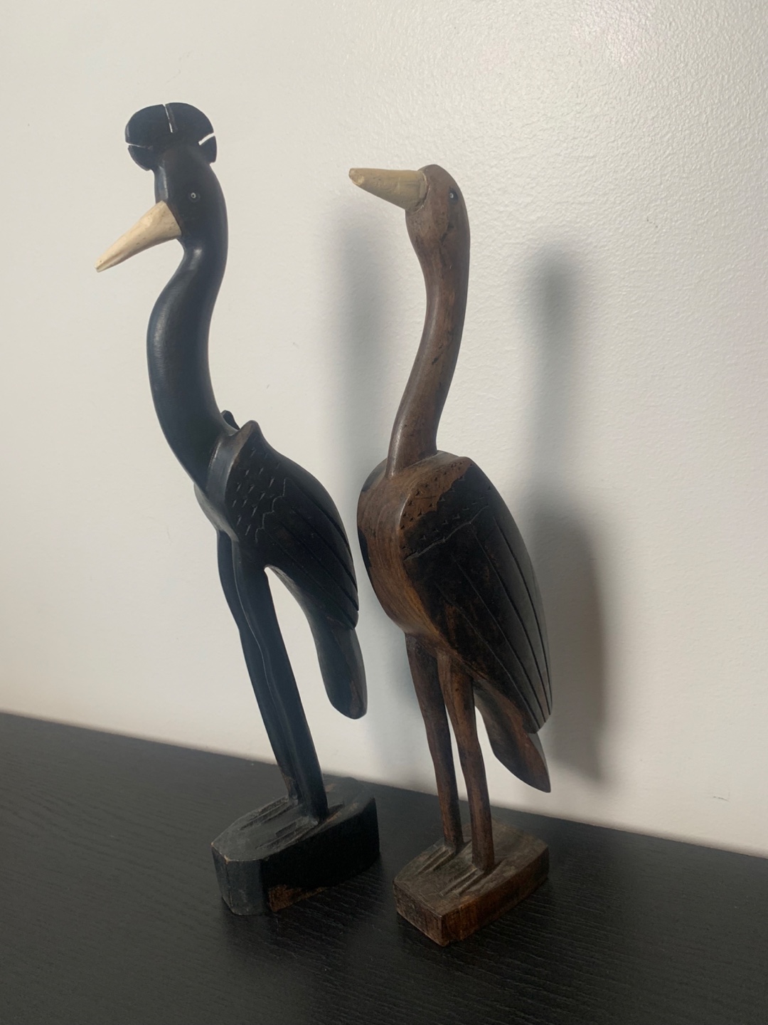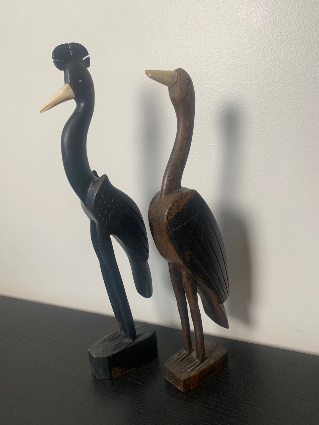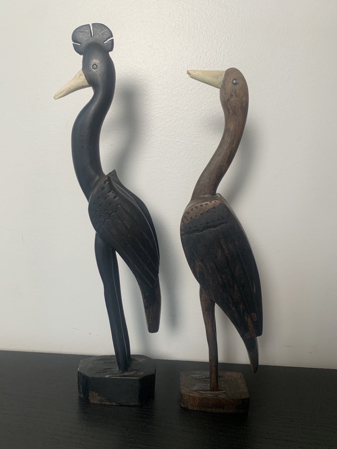 Selling a pair of vintage African hand-carved wooden bird sculptures! One is a darker wood than the other. They might be cranes. The smaller bird has a small chip on the end of her beak. They stand about 14 and 12.5 inches tall.