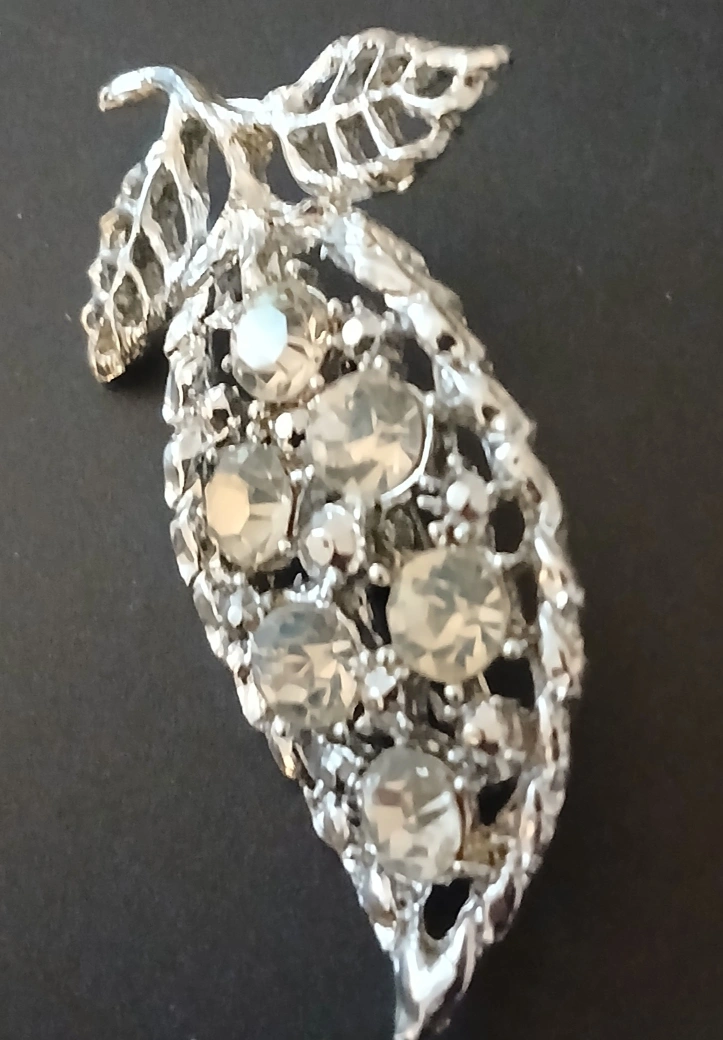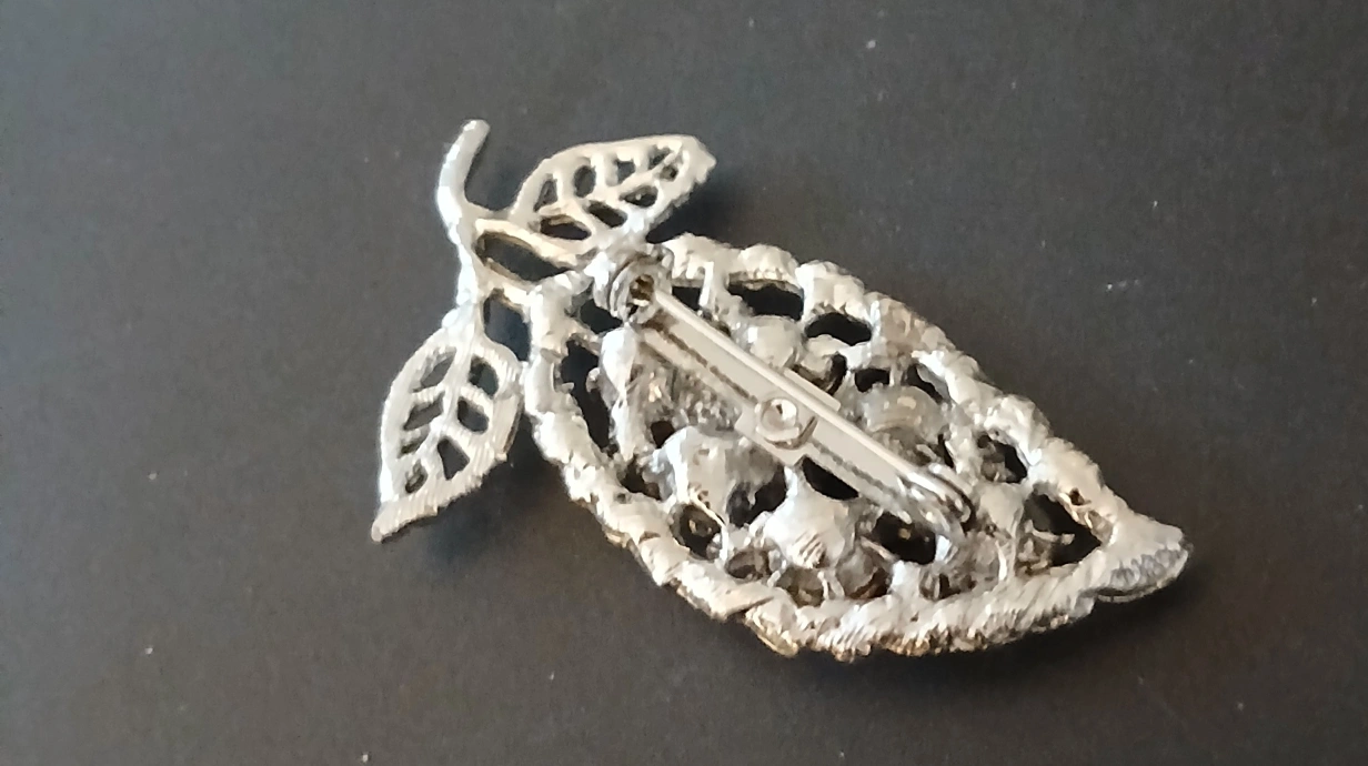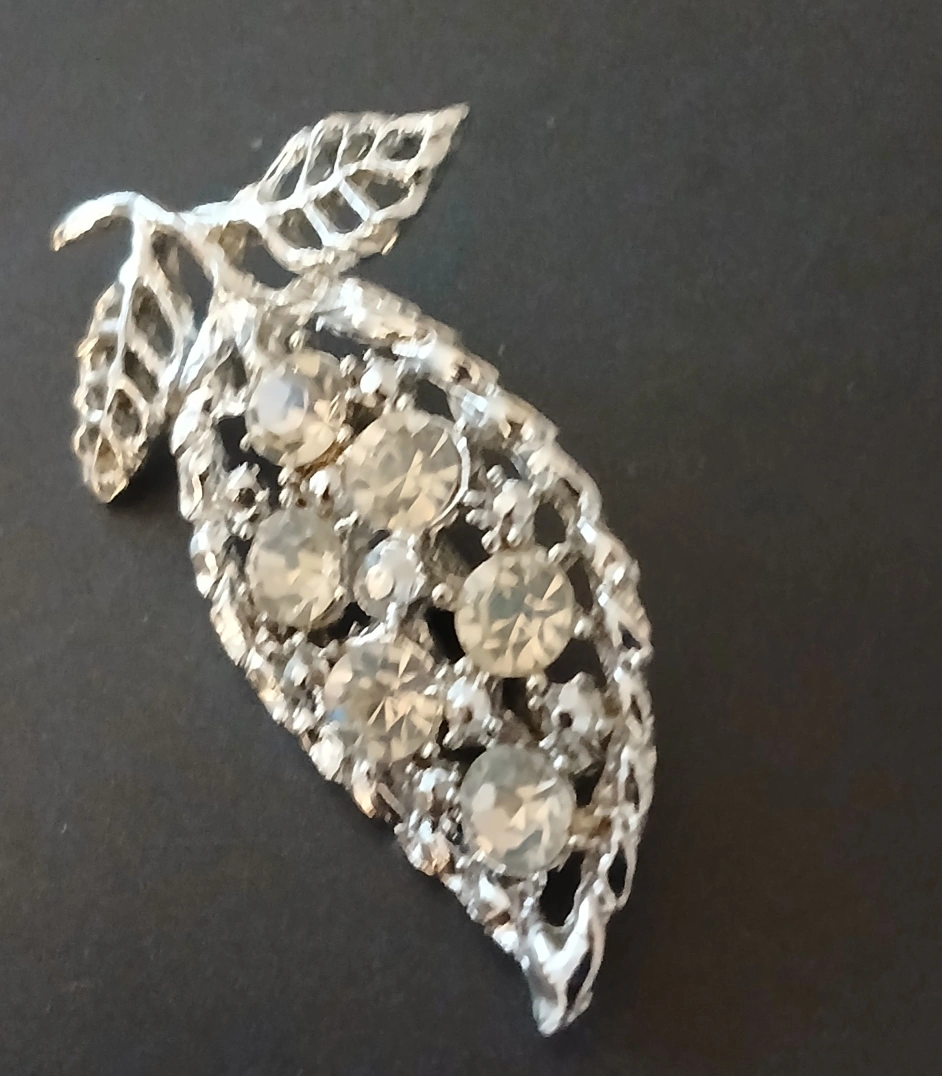 1000+Selling a lovely vintage leaf brooch pin. It features a detailed leaf design with sparkling rhinestones. It's in great condition 2x1 inches secure closure