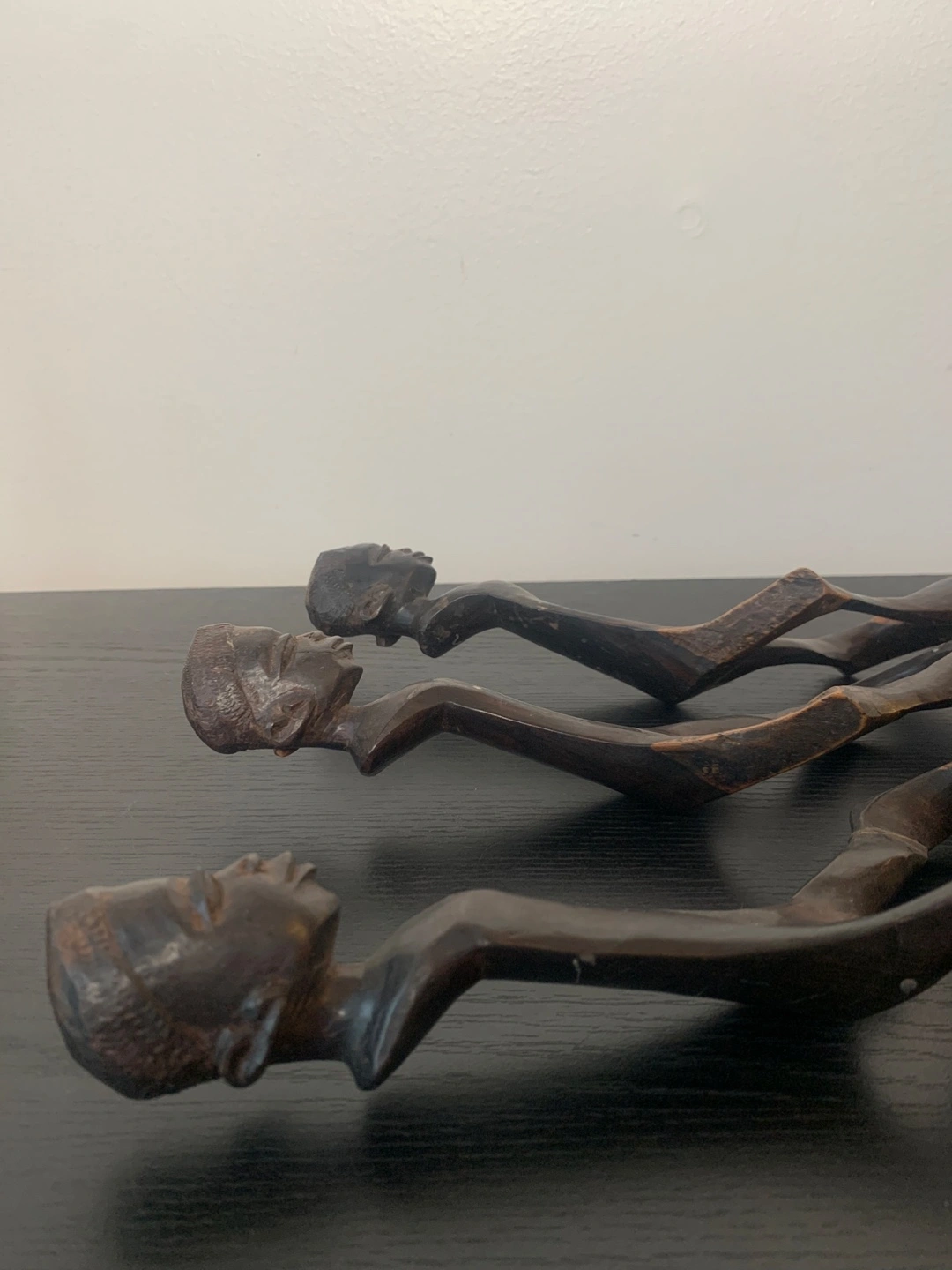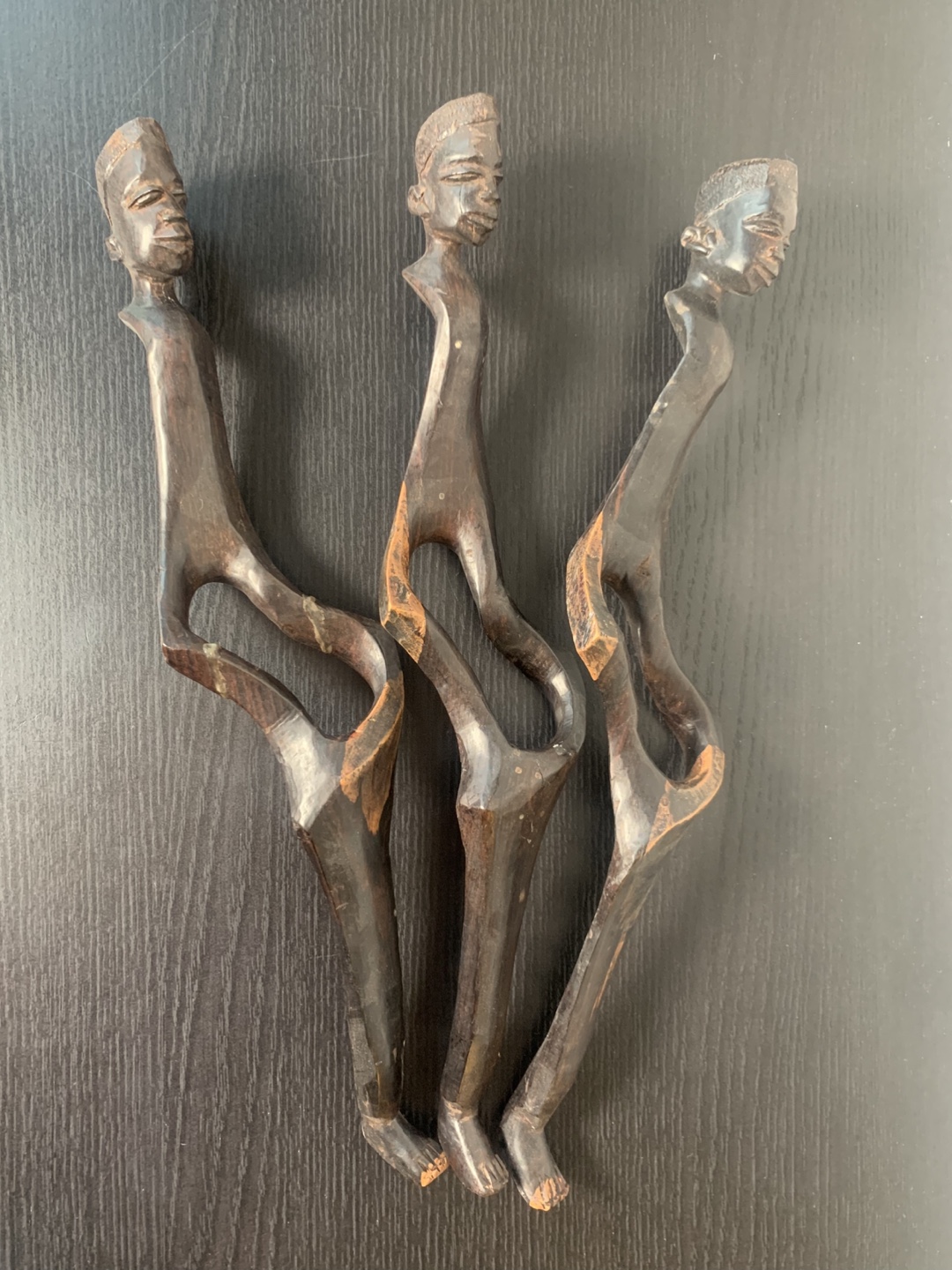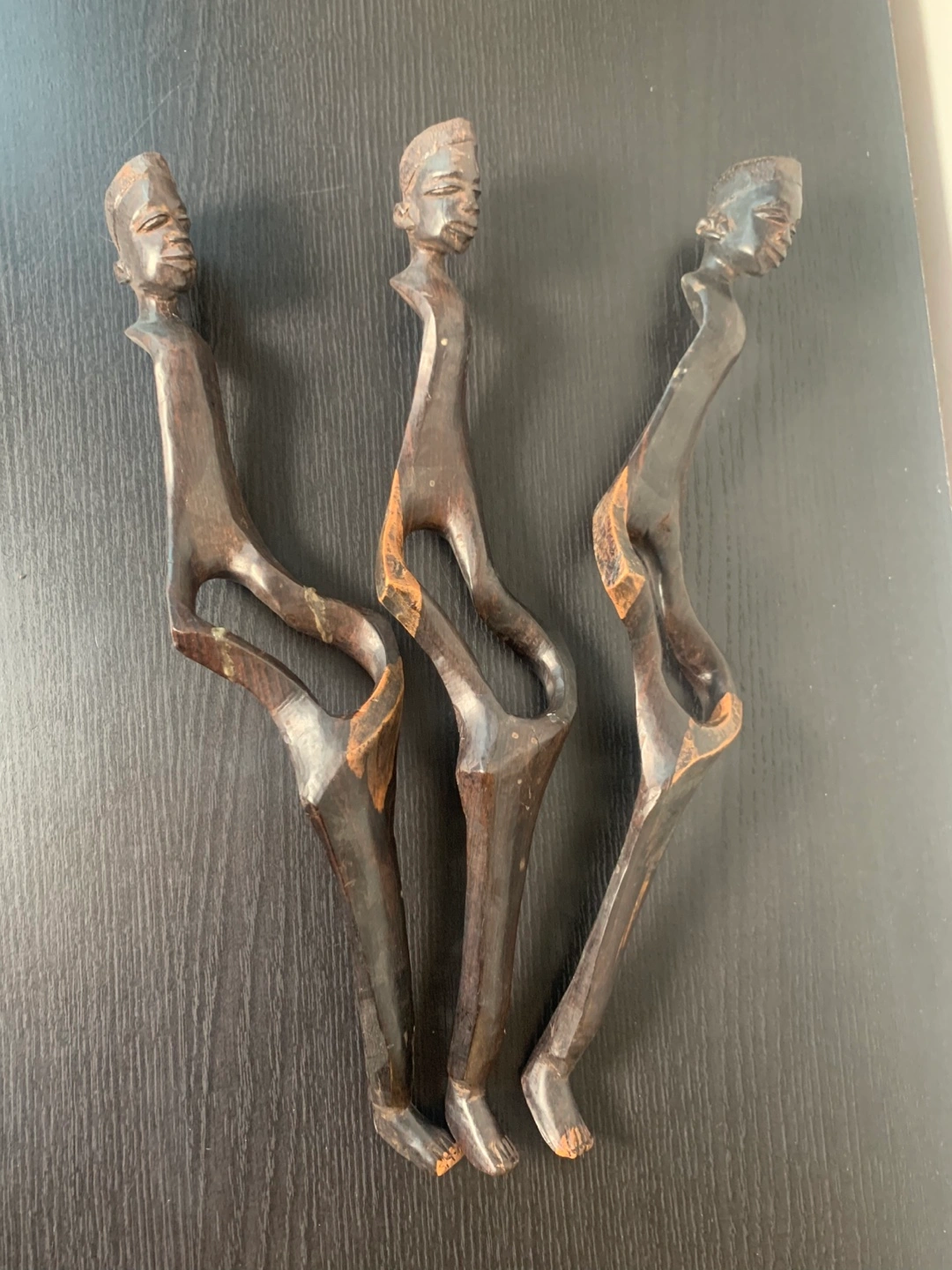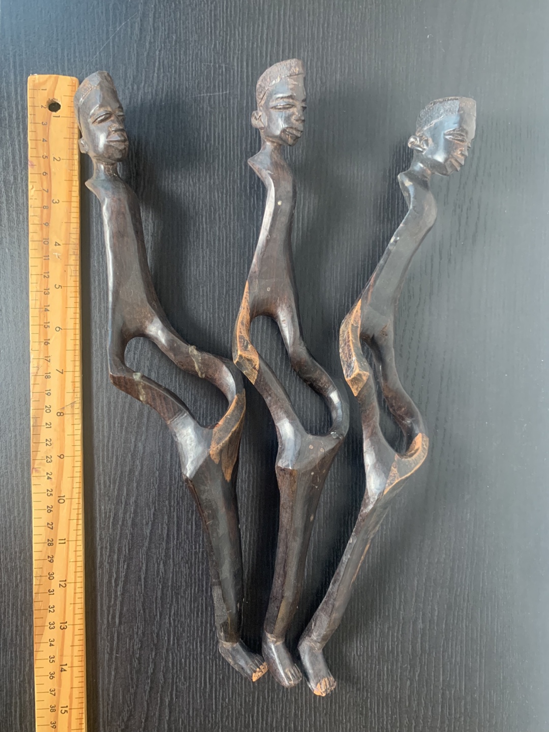 Selling a set of three unique African hand carved wooden figures. The figures are horizontal. I holes in the middle of the figures fit a hand, but I’m not sure what they would be used for.
